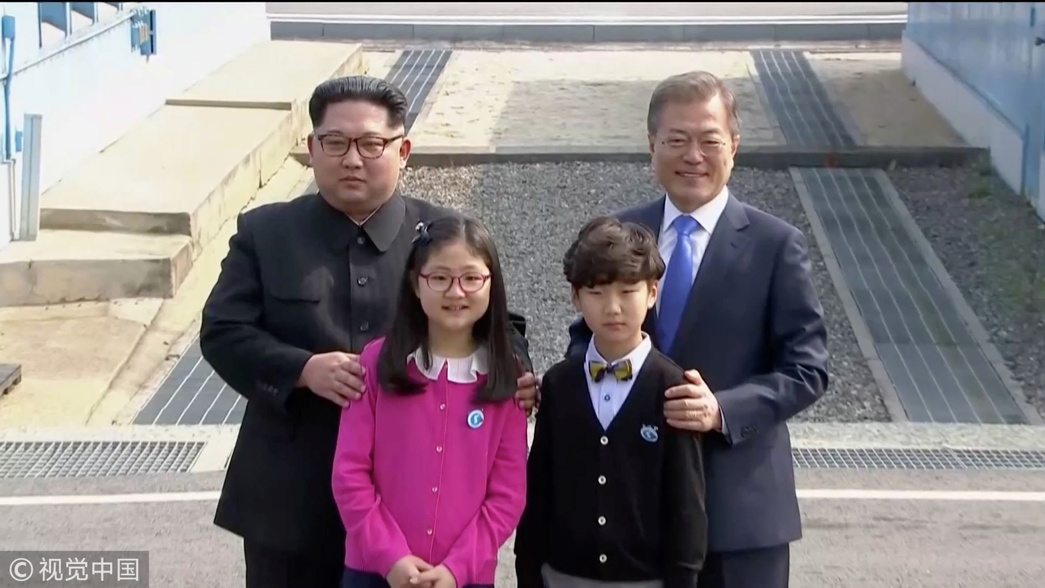 DPRK's leader Kim Jong Un and ROK's President Moon Jae-in pose for a photo with children ahead of the inter-Korean summit at the truce village of Panmunjom, April 27, 2018. /VCG Photo