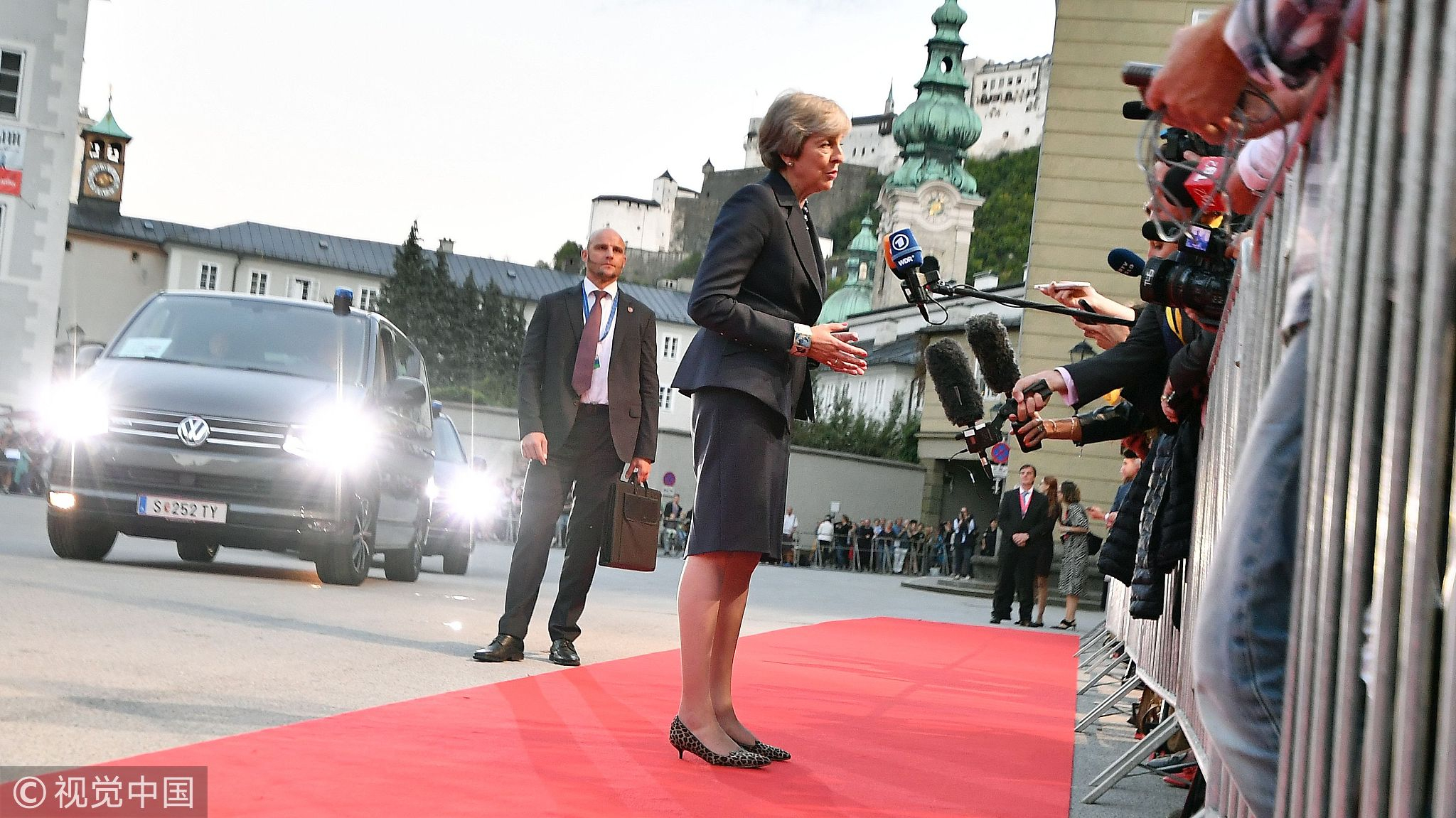 UK prime minister Theresa May meets the media before her informal dinner with EU leaders, Salzburg, Austria, September 19, 2018. /VCG Photo