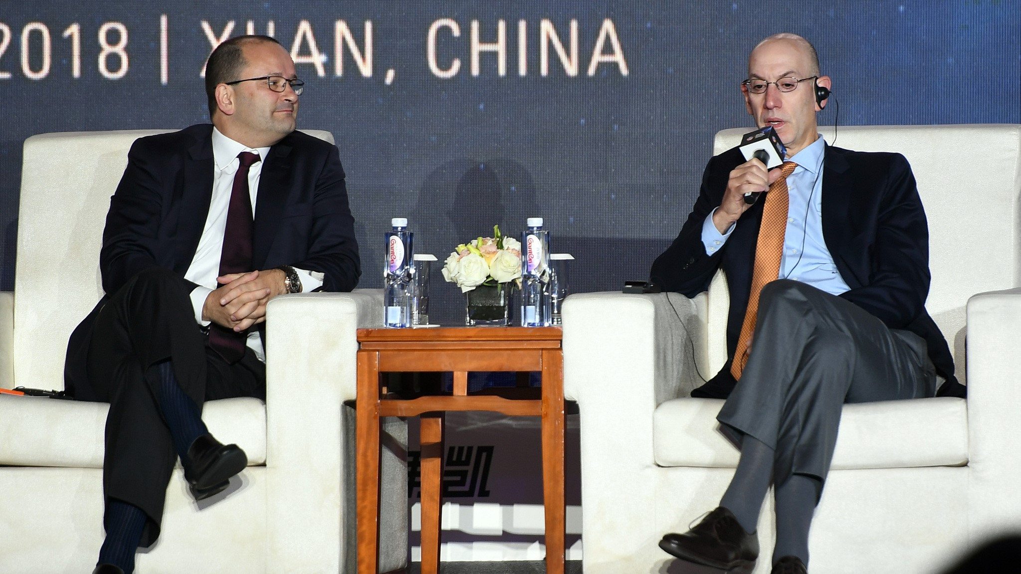 Patraick Baumann (L) with the NBA Commissioner Adam Silver (R) at the FIBA World Basketball Summit 2018 in Xi'an, capital city of northwest China's Shaanxi Province. /VCG Photo