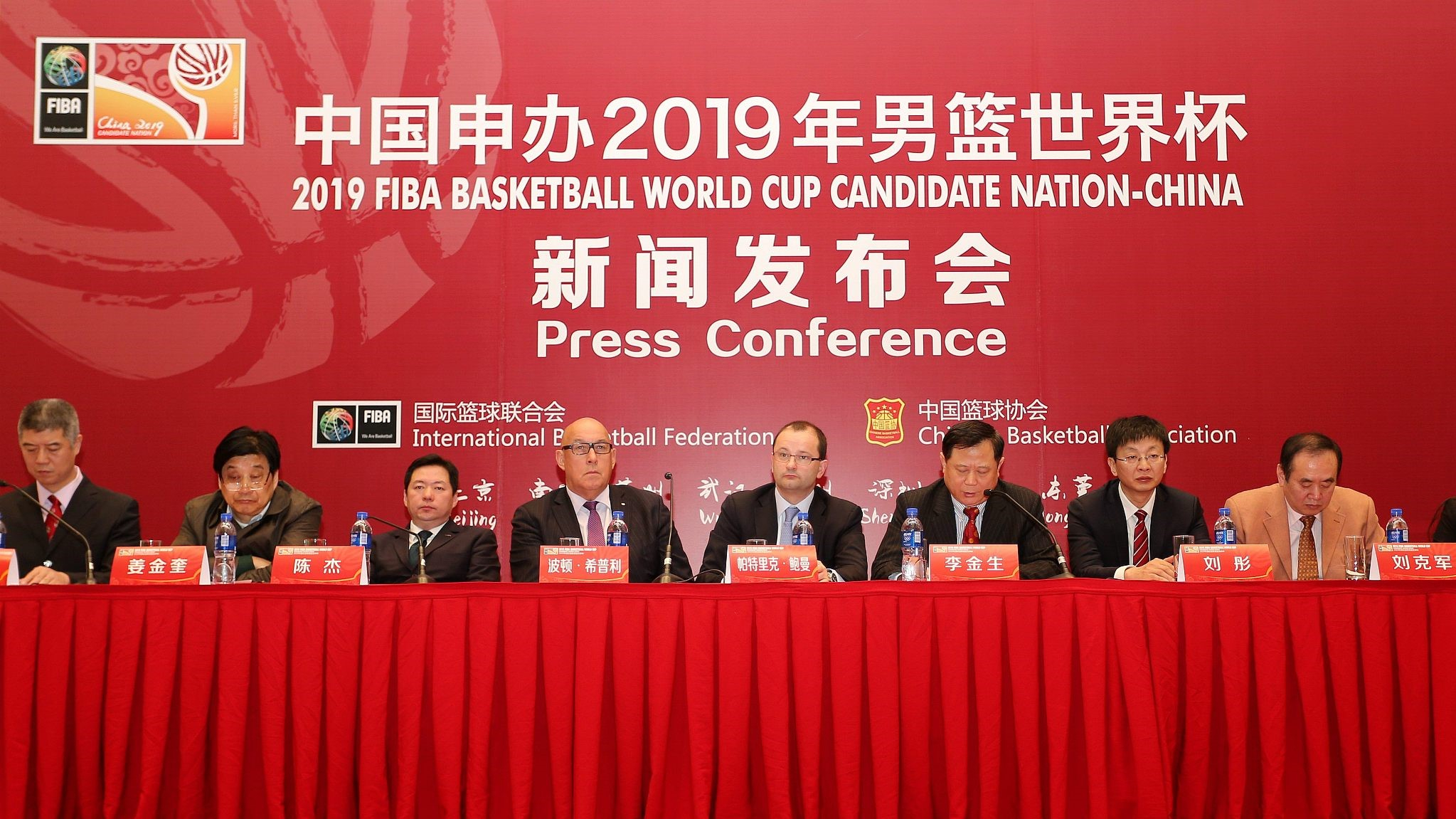Baumann (fifth from left) attending the press conference for China becoming candidate nation to bid for the 2019 FIBA Basektball World Cup. /VCG Photo