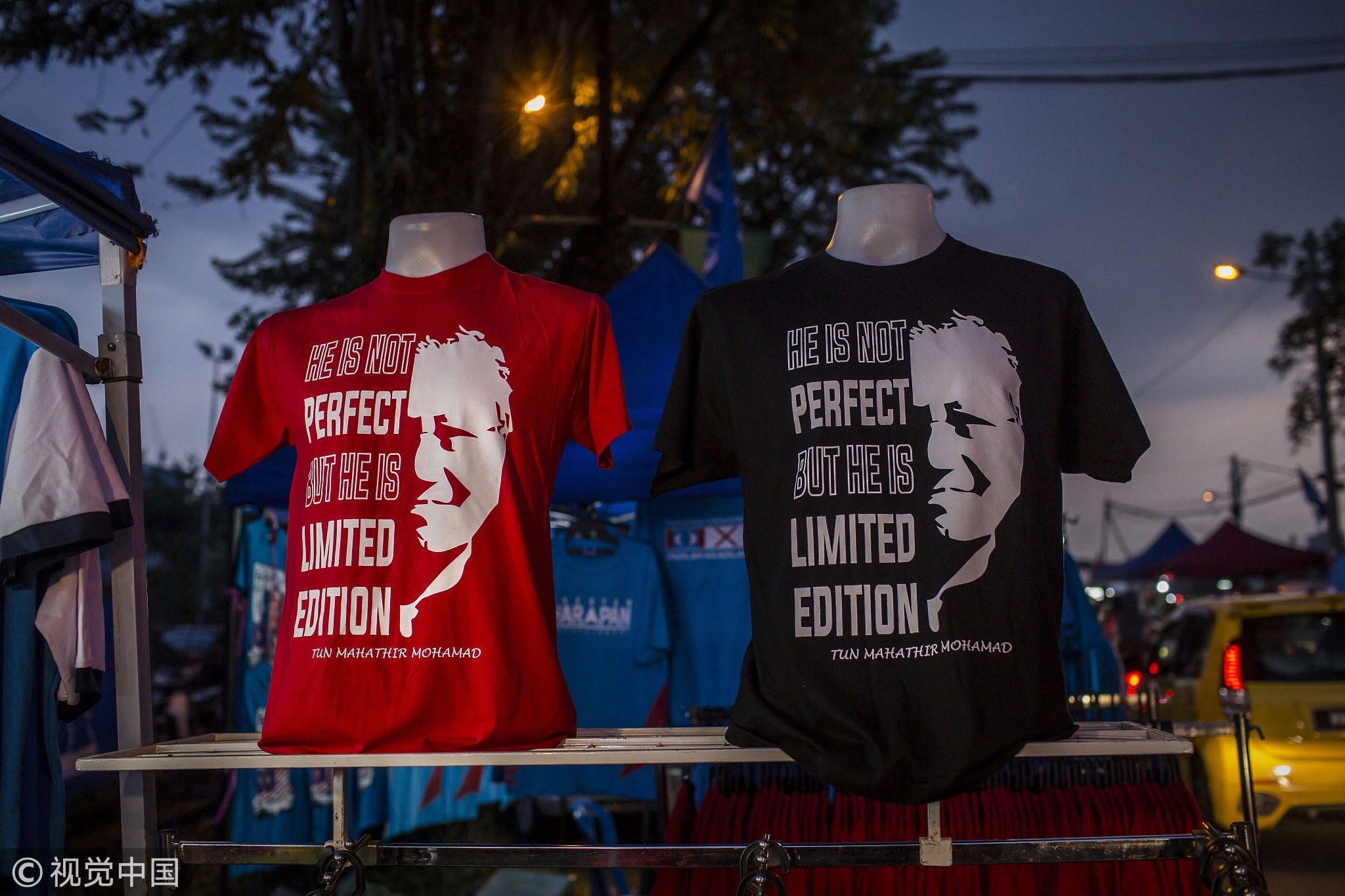 T-shirts sold at an opposition rally show a picture of Mahathir Mohamad alongside the words "He is not perfect but he is a limited edition" in Kuala Lumpur, Malaysia, May 6, 2018. /VCG Photo