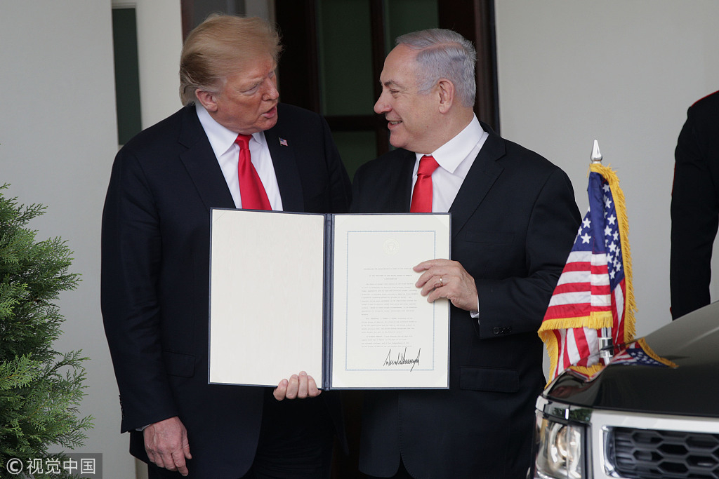 U.S. President Donald Trump (L) signed proclamation on recognizing Israel's sovereignty over Golan Heights, Washington DC, March 25, 2019. /VCG Photo