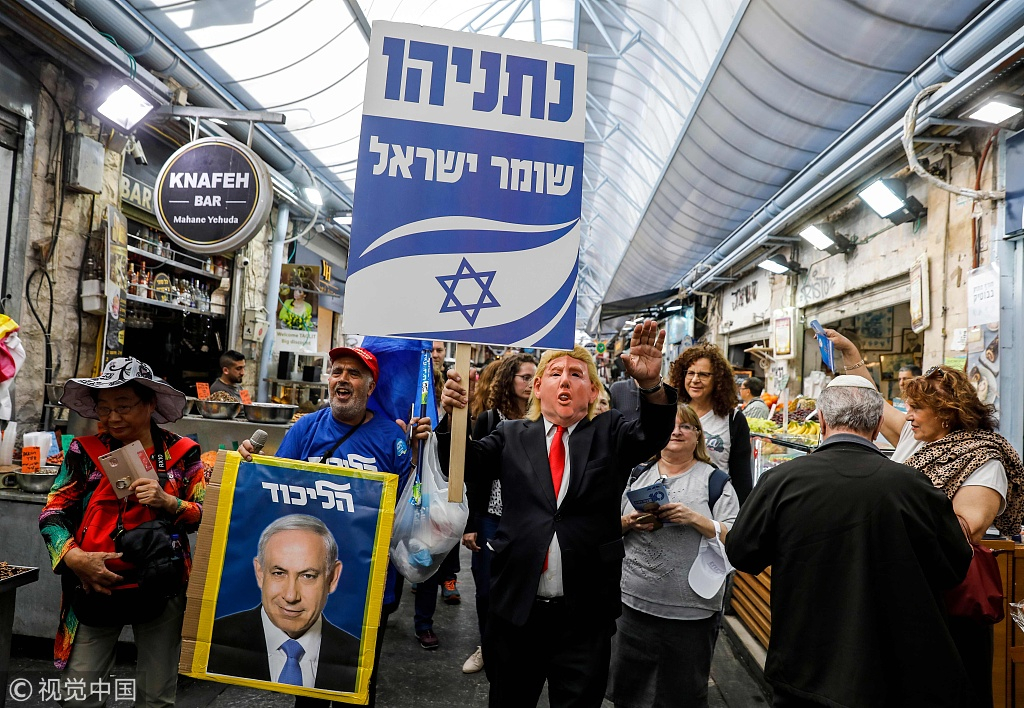 A supporter of Israeli Prime Minister Benjamin Netanyahu wearing a mask with the face of U.S. President Donald Trump marches with a sign that says "Guardian of Israel" in Hebrew, Jerusalem, April 7, 2019. /VCG Photo