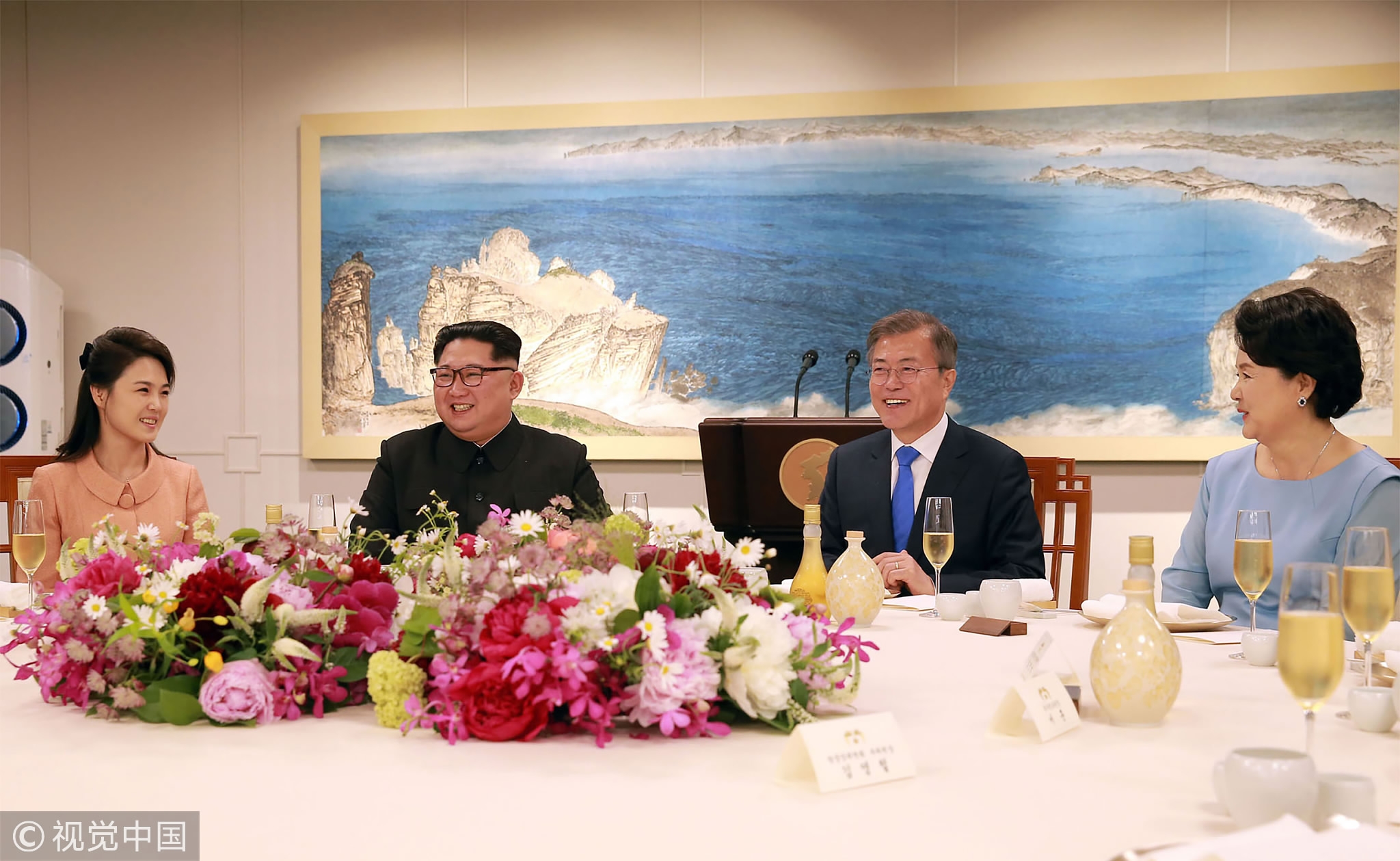 DPRK leader Kim Jong Un (2nd L) and his wife Ri Sol Ju (L) attending the official dinner with ROK President Moon Jae-in (2nd R) and his wife Kim Jung-sook at the end of their historic summit at the truce village of Panmunjom on April 27, 2018. /VCG Photo