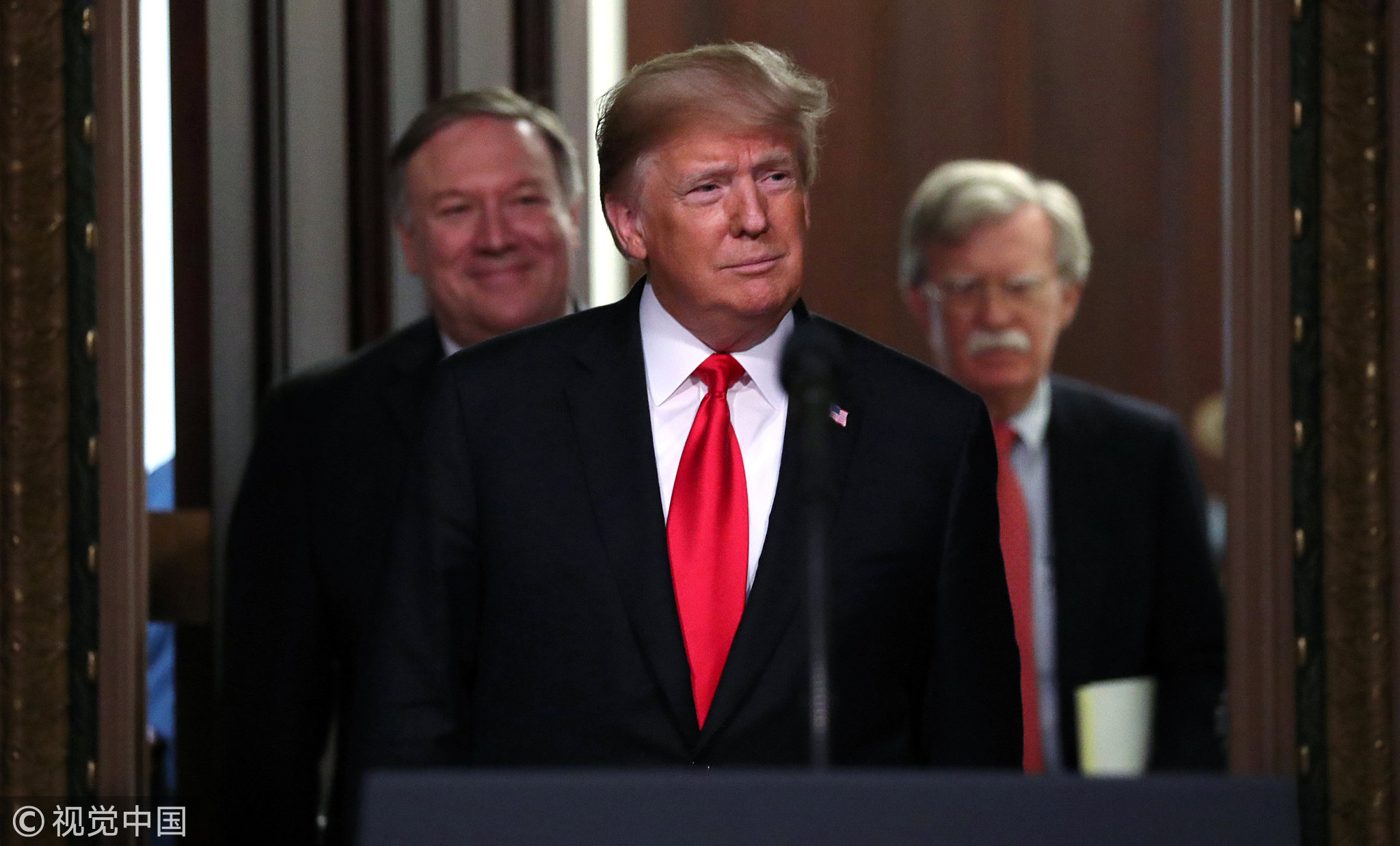 US President Donald Trump arrives flanked by Secretary of State Mike Pompeo (L) and US National Security Advisor John Bolton (R) for the annual meeting of the Interagency Task Force to Monitor and Combat Trafficking in Persons at the White House in Washington, US, October 11, 2018. /VCG Photo