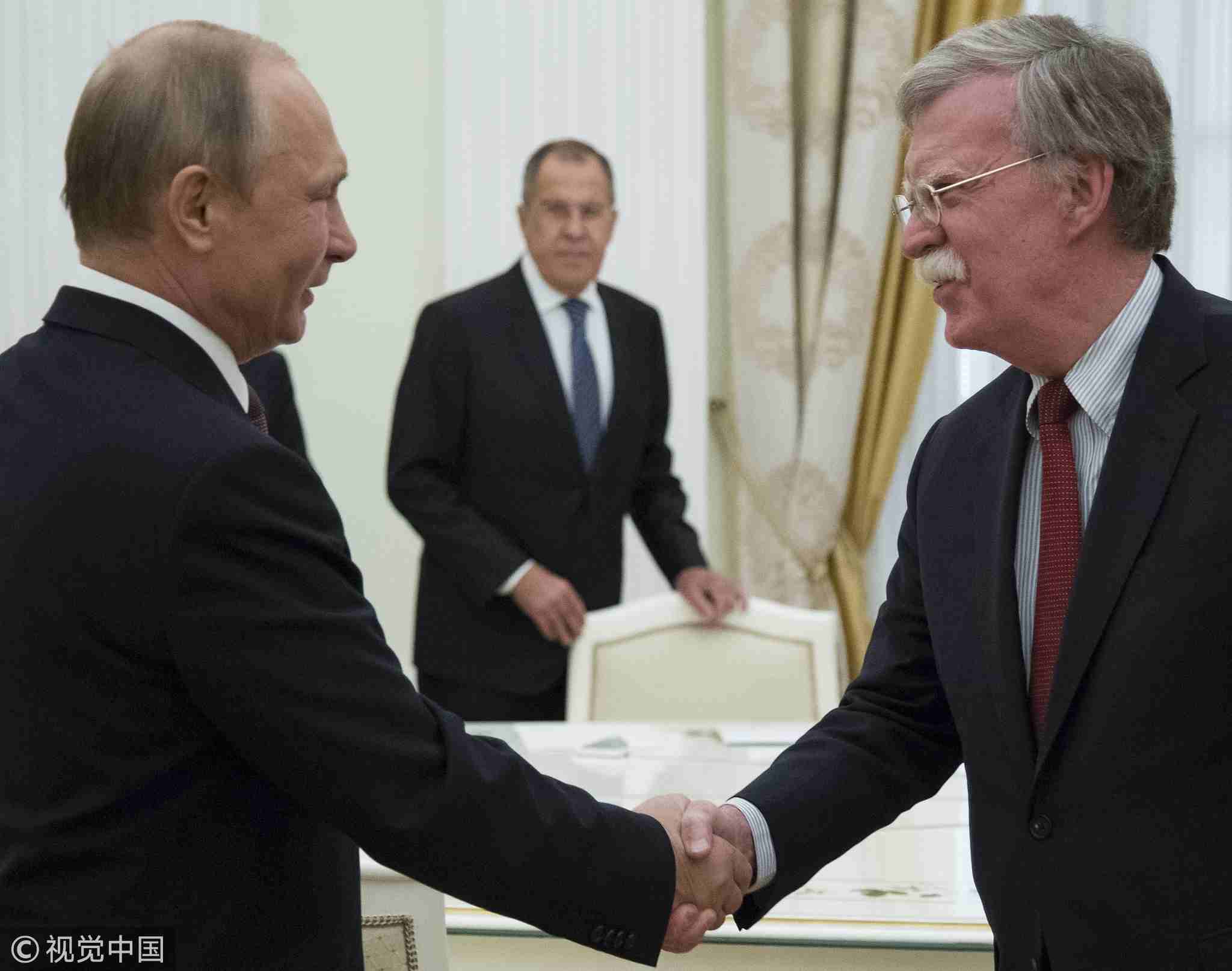 Russian President Vladimir Putin (L) shakes hands with US National Security Adviser John Bolton as Russian Foreign Minister Sergei Lavrov (C) looks at them during the meeting in the Kremlin in Moscow, Russia, on June 27. /VCG Photo
