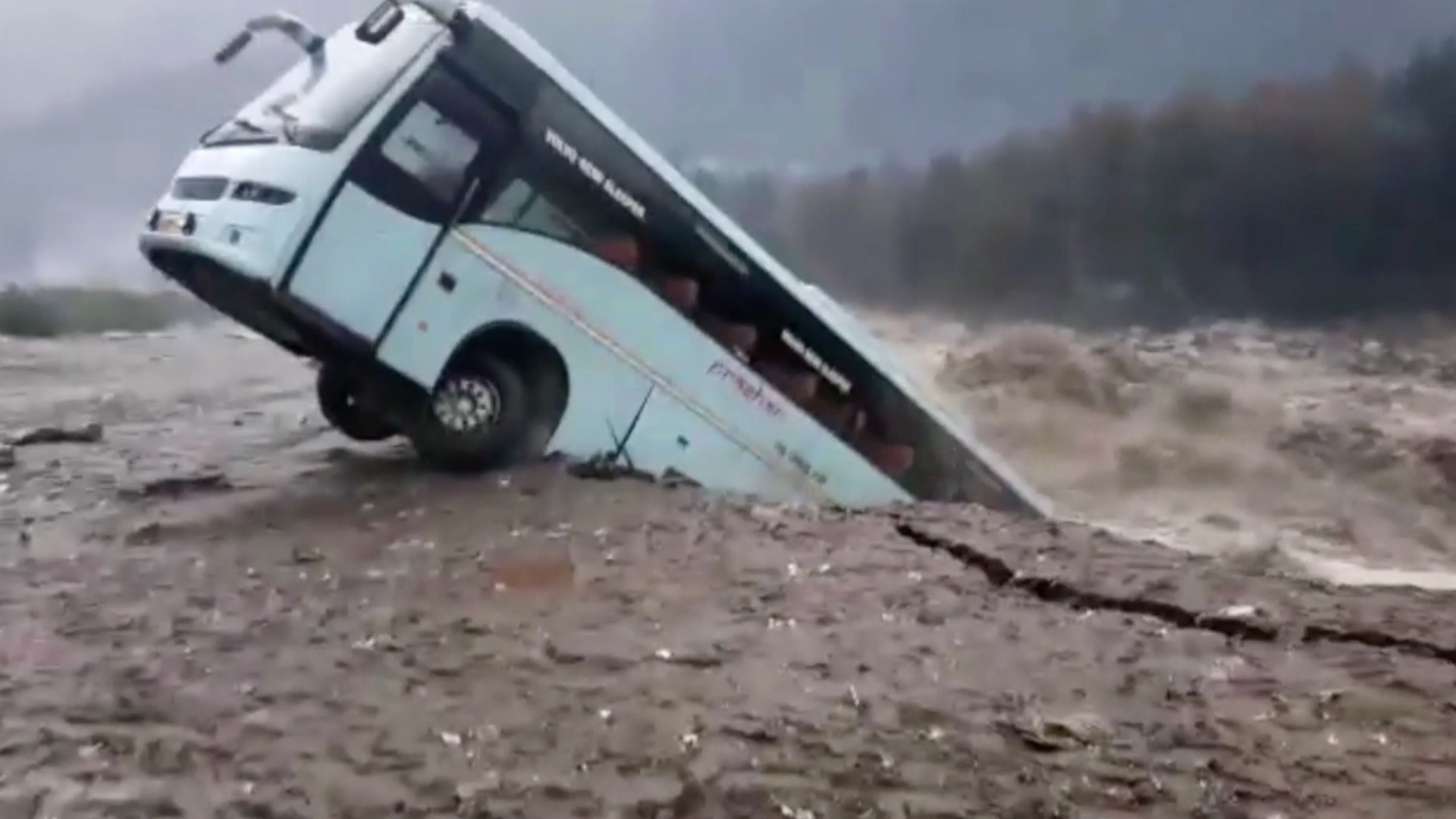 A bus was swept away by the surging waters of a raging river following heavy downpours in northern India. No passengers were on the bus when the incident happened on Sunday.