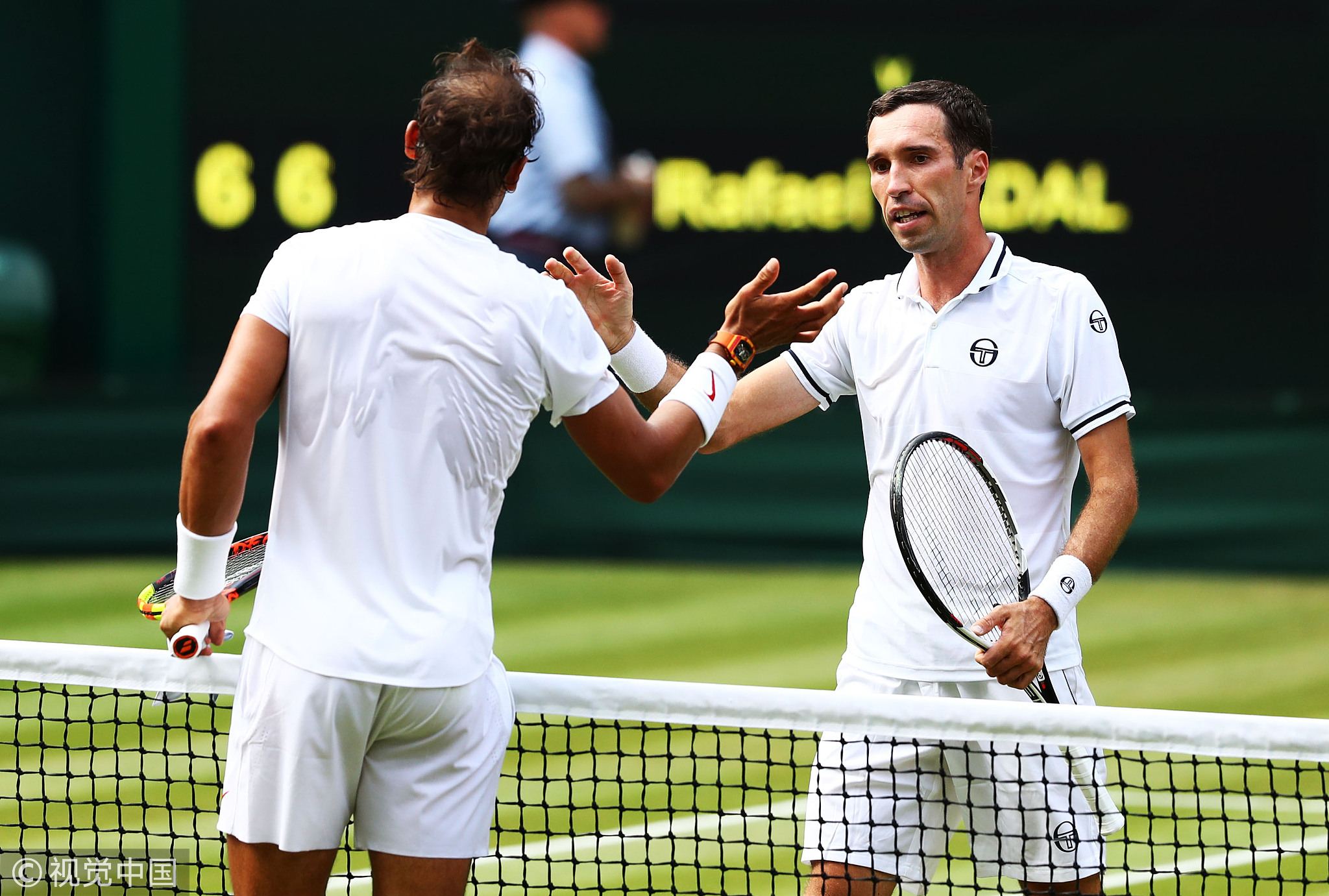Rafael Nadal of Spain shakes hands with Mikhail Kukushkin of Kazakhstan during their Men's Singles second round match on day four of the Wimbledon Lawn Tennis Championships at All England Lawn Tennis and Croquet Club, July 5, 2018 in London, England. /VCG Photo