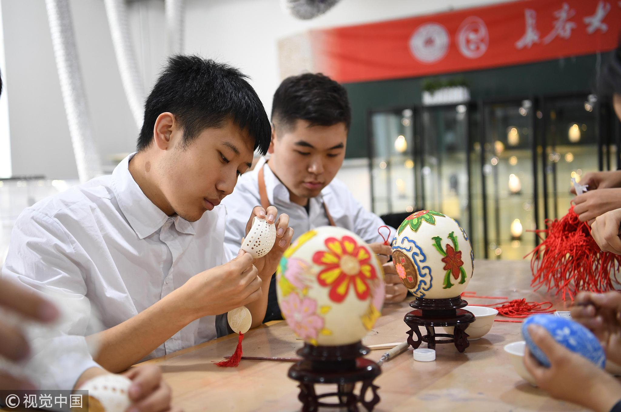 The students are showing egg carving works in the art practice room at Changchun University, northeast China’s Jilin Province on Tuesday. All of them are hearing impaired students. /VCG Photo