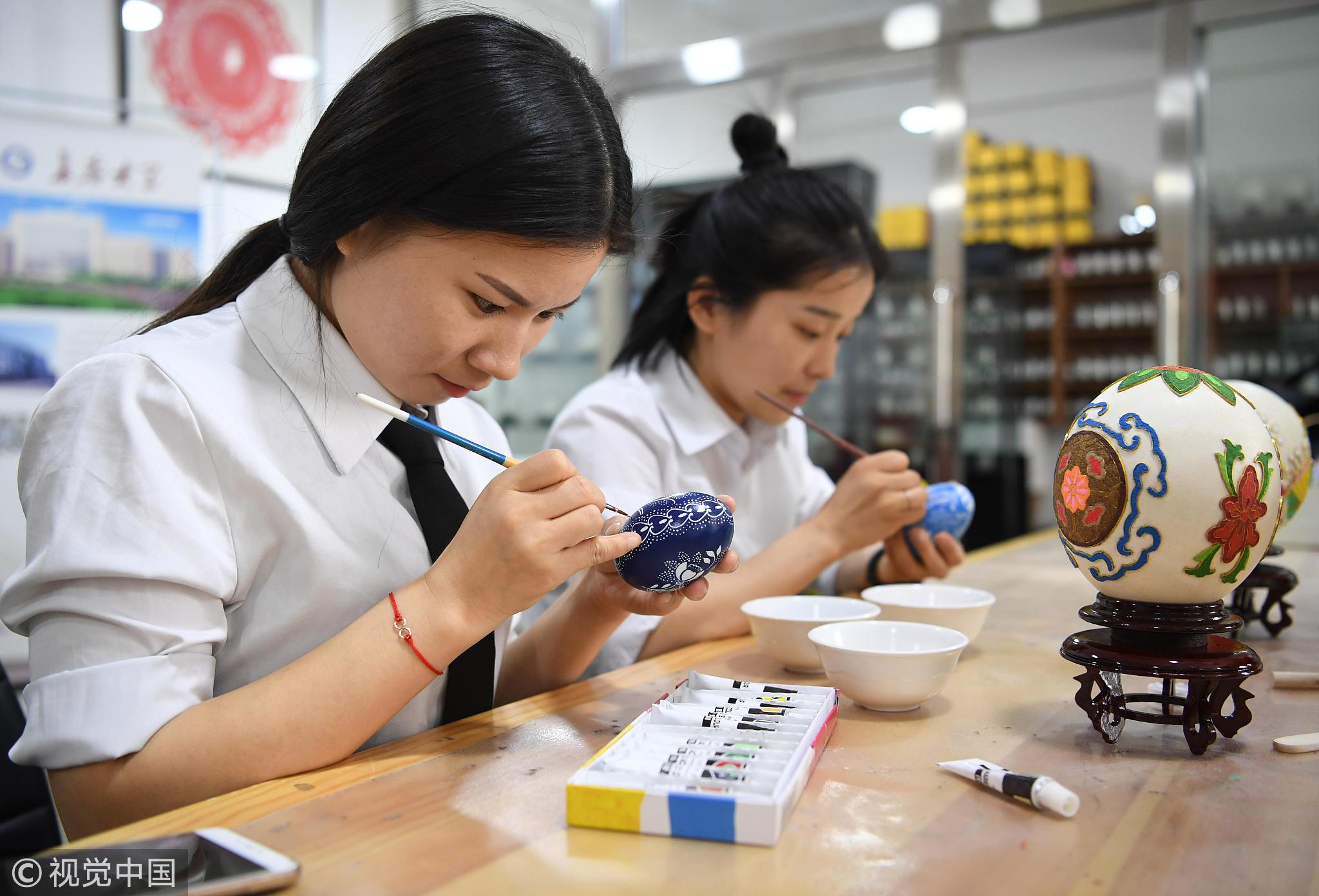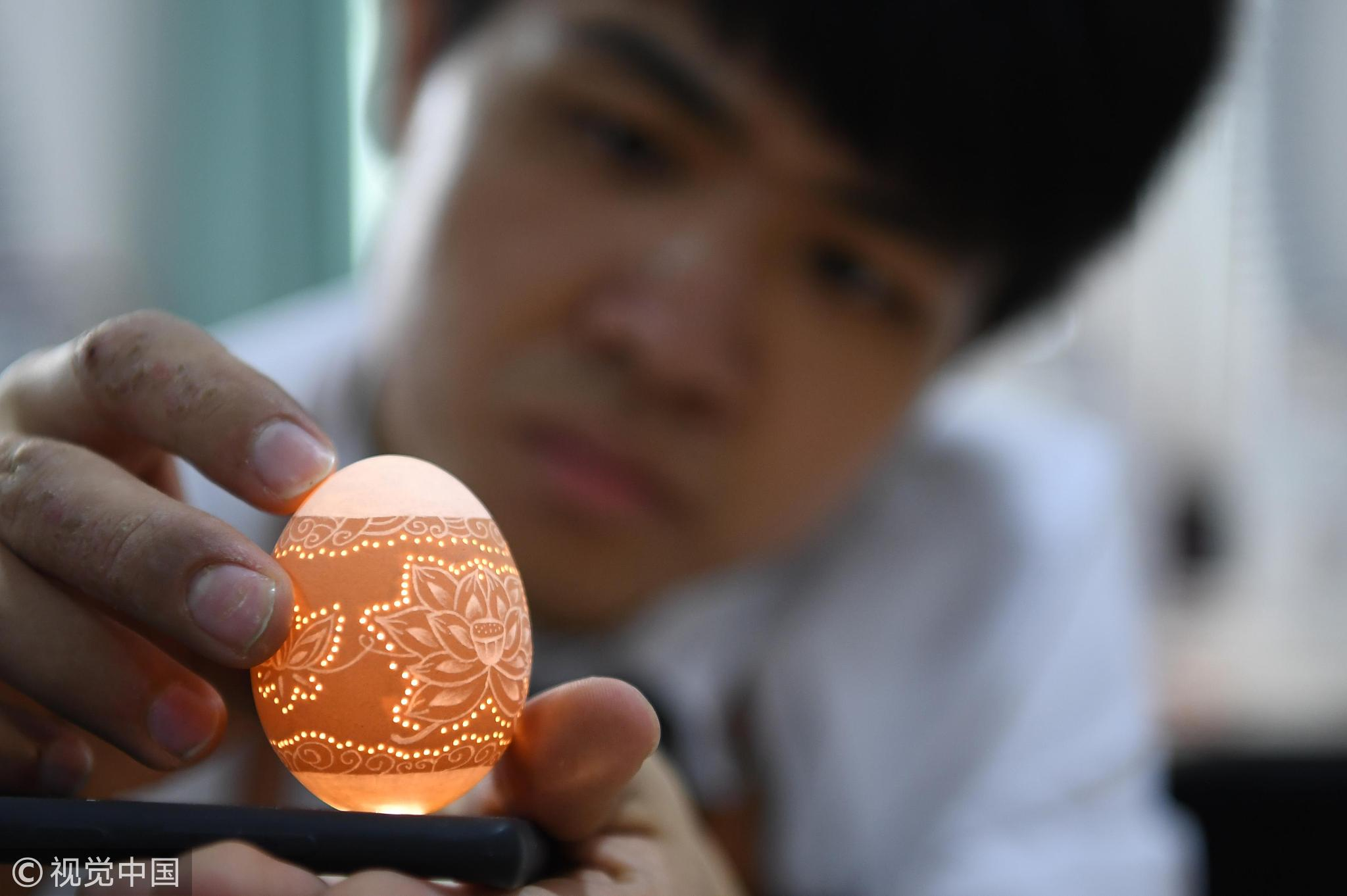 The students were creating a beautiful world in the thickness of only a few millimeters eggshell with the silent world. /VCG Photo