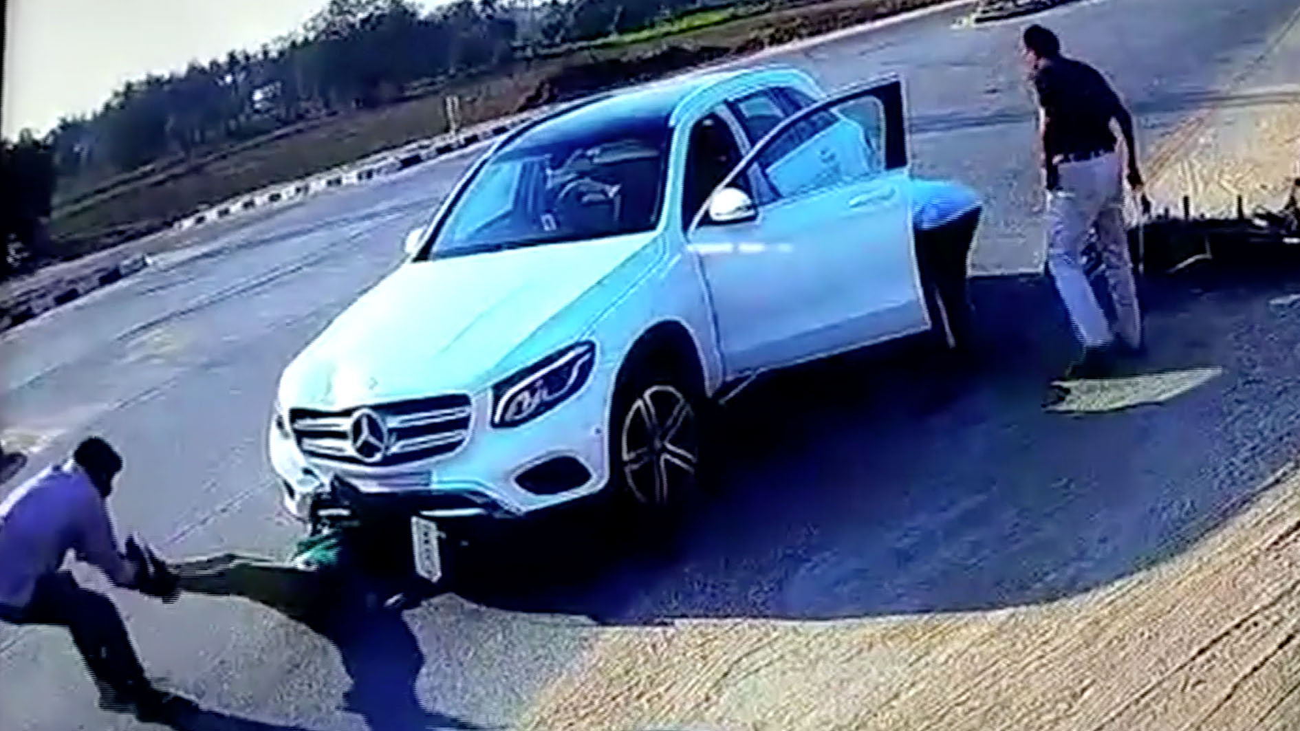 An Indian couple walked away with only minor injuries after being run over by a car. Horrifying surveillance footage shows an SUV crashing into a motorcycle, knocking a couple to the ground. The motorist seems unable to halt the vehicle, dragging the two under the wheels. The driver of the motorbike quickly gets up but the female passenger remains stuck beneath the front wheels of the SUV. The driver slowly reverses and releases her. The couple was treated for only minor injuries.