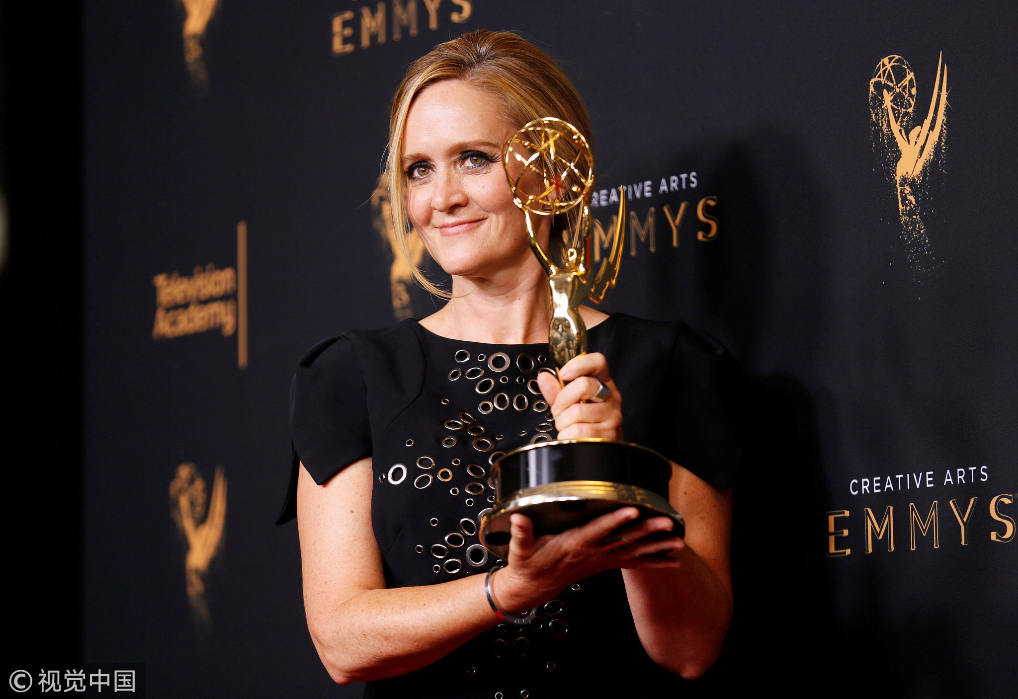 Samantha Bee holds an Emmy Award for Outstanding Writing for a Variety Special for "Full Frontal With Samantha Bee Presents Not The White House Correspondents" backstage at the 2017 Creative Arts Emmy Awards in Los Angeles, California, US, Sep. 9, 2017. /VCG Photo