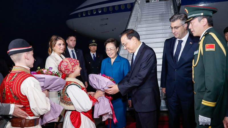 Upon Li's arrival, Croatian Prime Minister Andrej Plenkovic and his wife Ana Plenkovic led a warm welcome ceremony at the Zagreb Airport. Children dressed in national costumes presented flowers to Premier Li and his wife Cheng Hong.