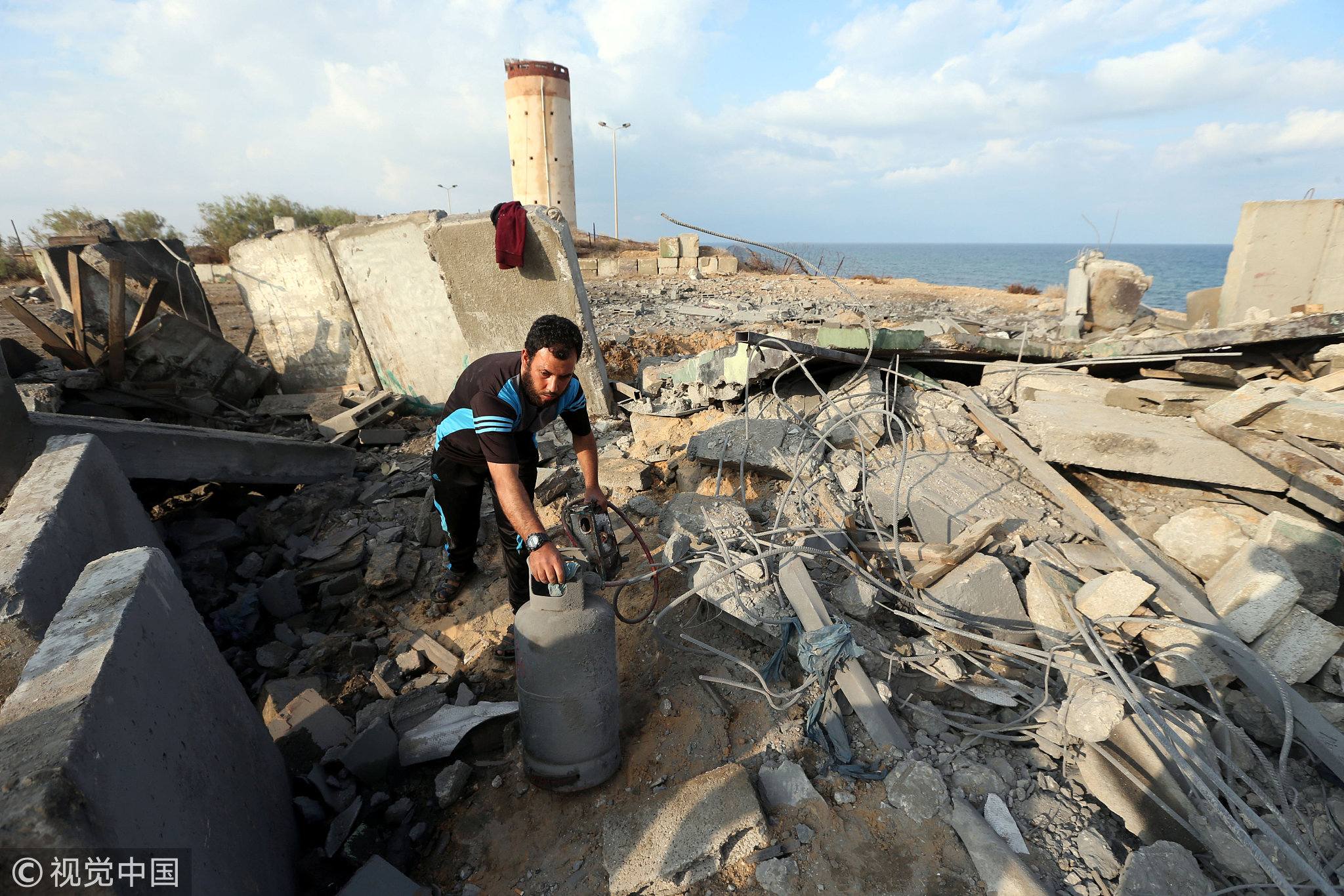 A Palestinian man inspects the scene of an Israeli air strike in the southern Gaza Strip, October 17, 2018. /VCG Photo