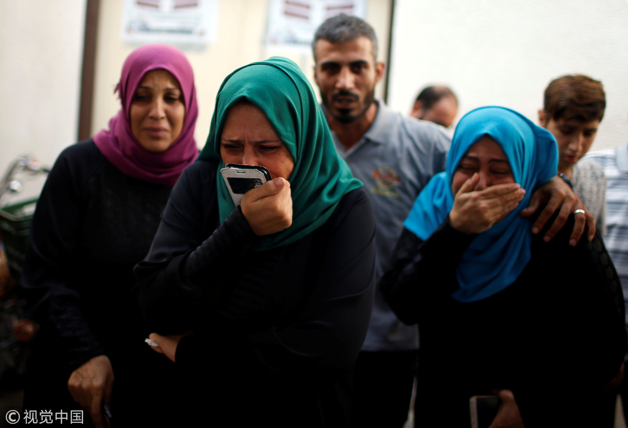Relatives of a Palestinian, who was killed in an Israeli air strike, react at a hospital in the northern Gaza Strip, October 17, 2018. /VCG Photo
