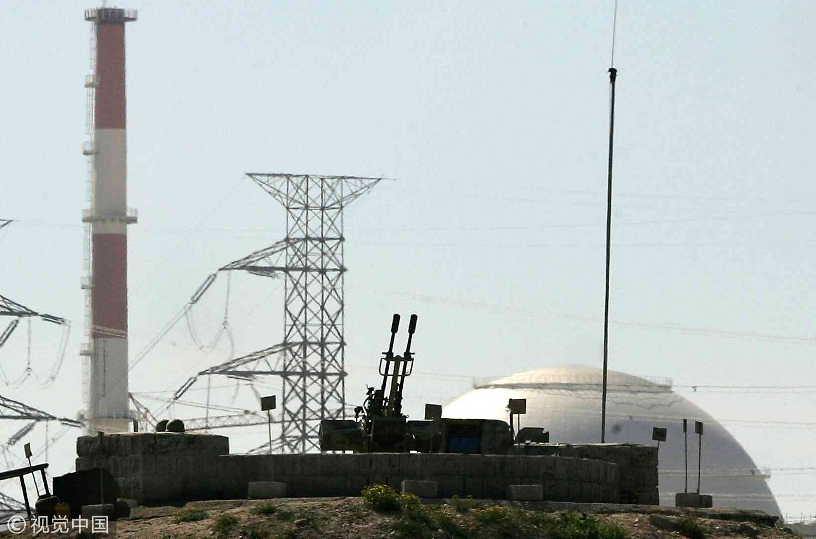 An anti-aircraft machine-gun is seen in front of the reactor building of the Bushehr nuclear power plant, in southern Iran, February 26, 2018. /VCG Photo