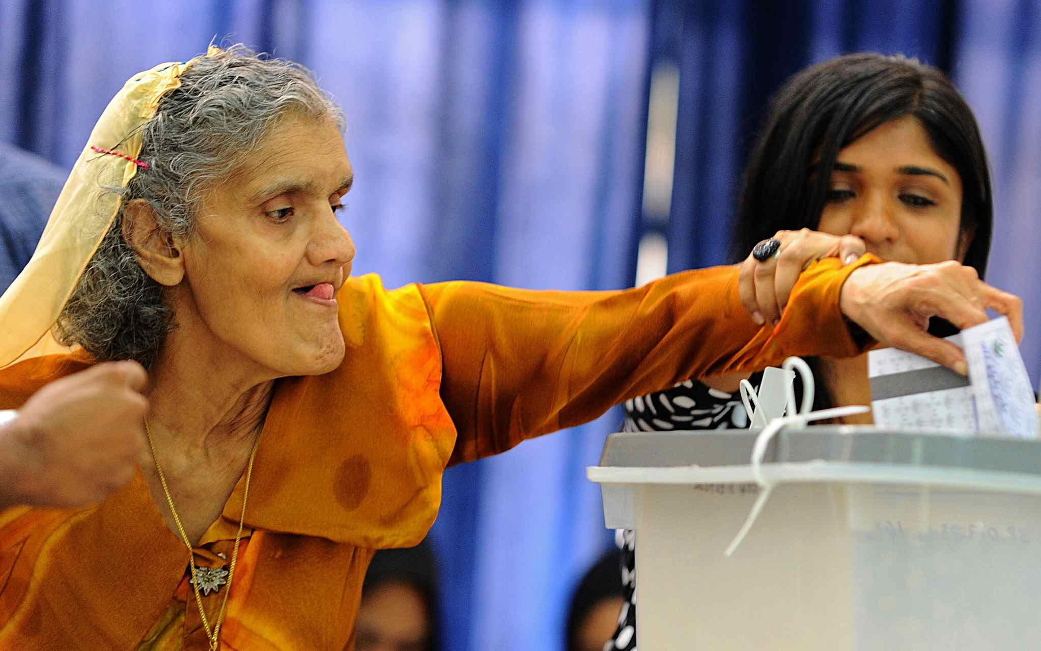 A Maldivian voter (L) casts her ballot at a polling station in Male, November 9, 2013. /VCG Photo