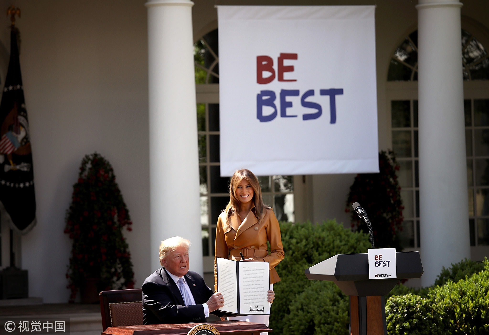 Donald Trump holds up a proclamation for 'National Be Best Day' after US first lady Melania Trump spoke in the Rose Garden of the White House May 7, 2018 in Washington, DC. /VCG Photo
