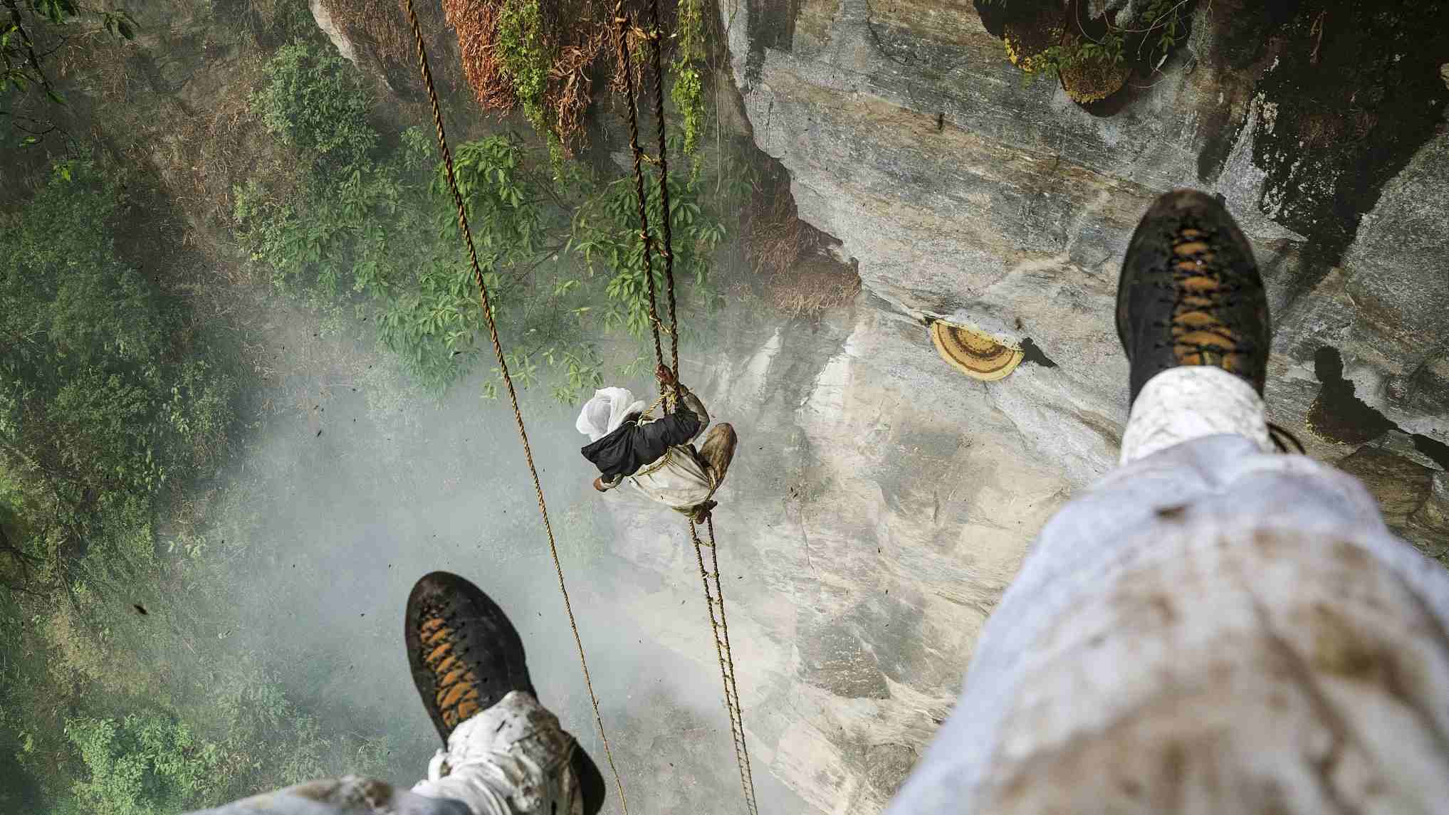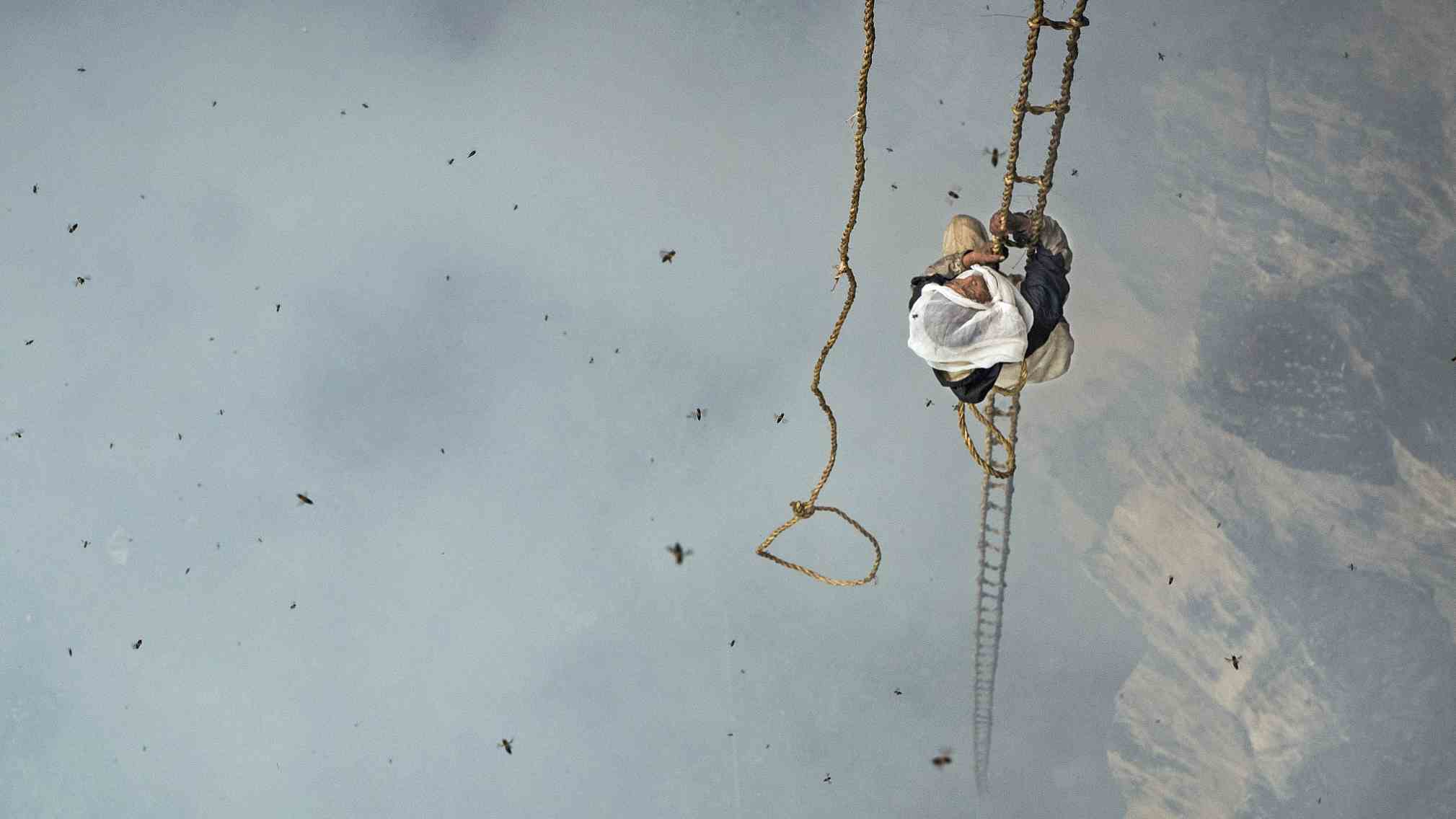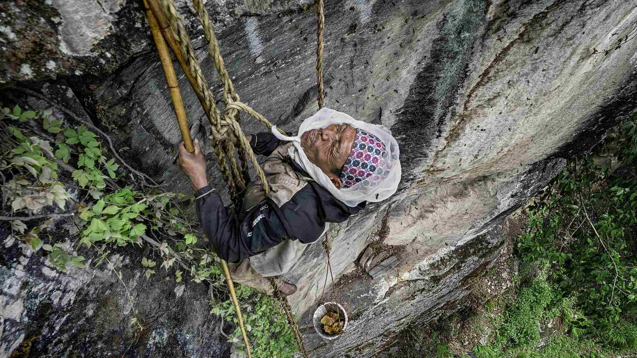 Mauli Dhan, 57, a Kulung from eastern Nepal said to be the last honey-hunter in the country, dangles on a 150-meter-high (500ft) bamboo rope ladder to harvest extremely rare honey from thousands of Himalayan giant honeybees. To disorient the bees and avoid stings, he used smoldering grass to create smoke when cutting away the large hive. /VCG Photo