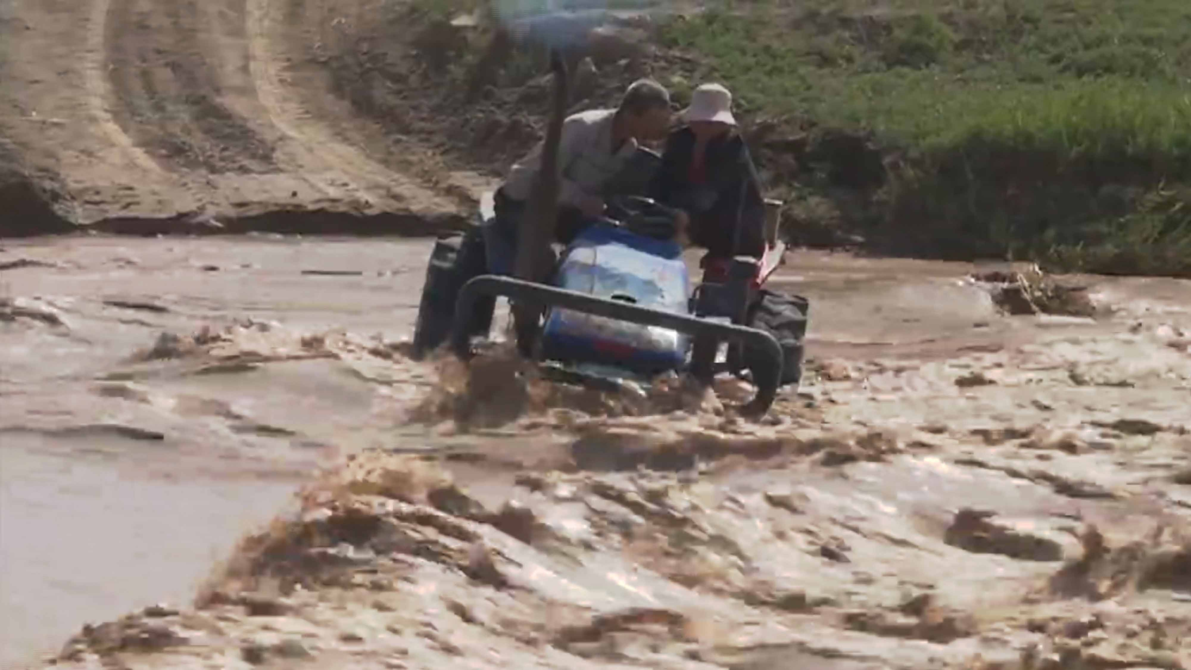 Firefighters and local villagers saved a couple trapped on a tractor and stranded in rapid floodwaters in northwest China’s Xinjiang Uygur Autonomous Region on June 23.