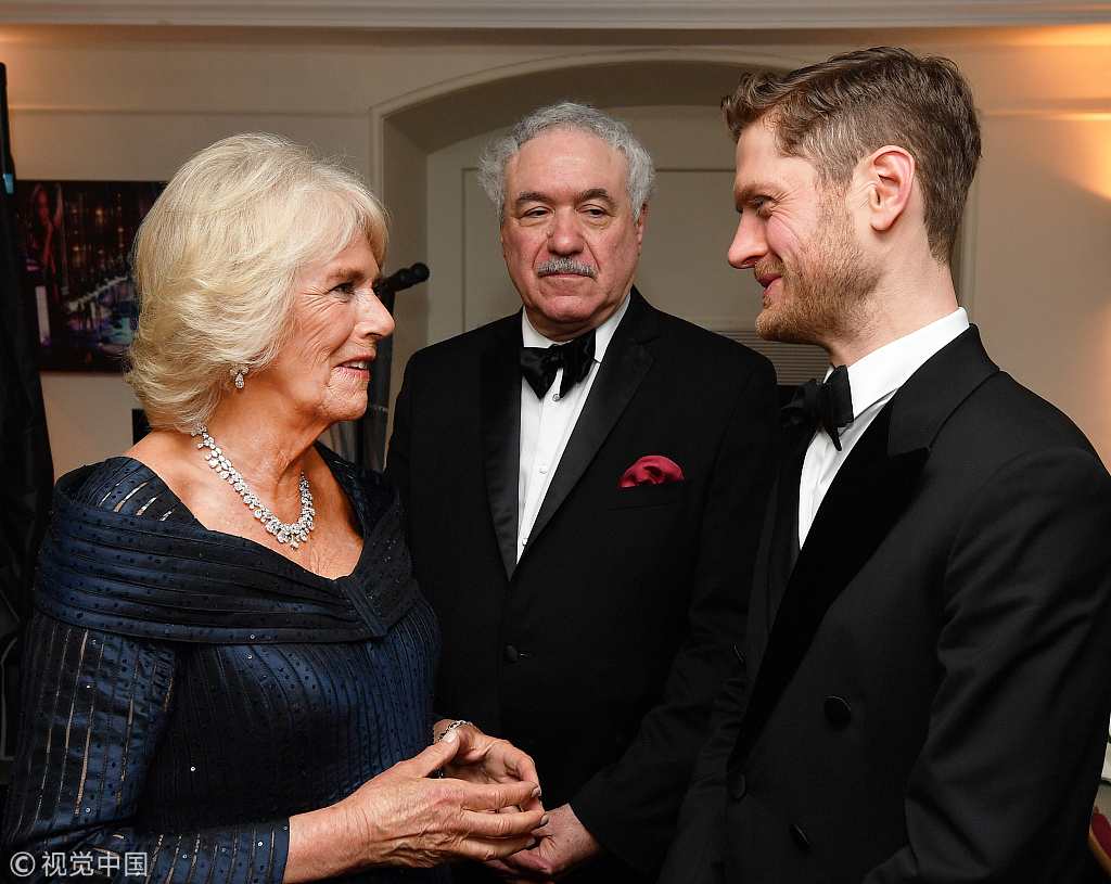 The Duchess of Cornwall talks to Kyle Soller(R), winner of the best actor award, after attending the Olivier Awards at the Royal Albert Hall in London. /VCG Photo