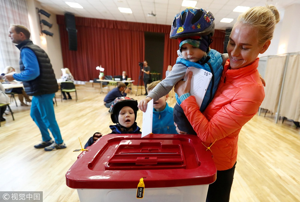 A child casts her mother's vote during a general election in Ikskile, Latvia, October 6, 2018. /VCG Photo