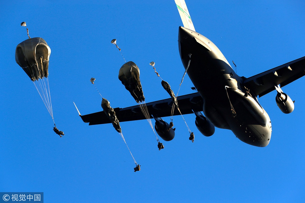 US Army paratroopers leave a C-17 aircraft to land during NATO exercise Swift Response 2018 on Adazi military ground, Latvia, June 9, 2018. /VCG Photo