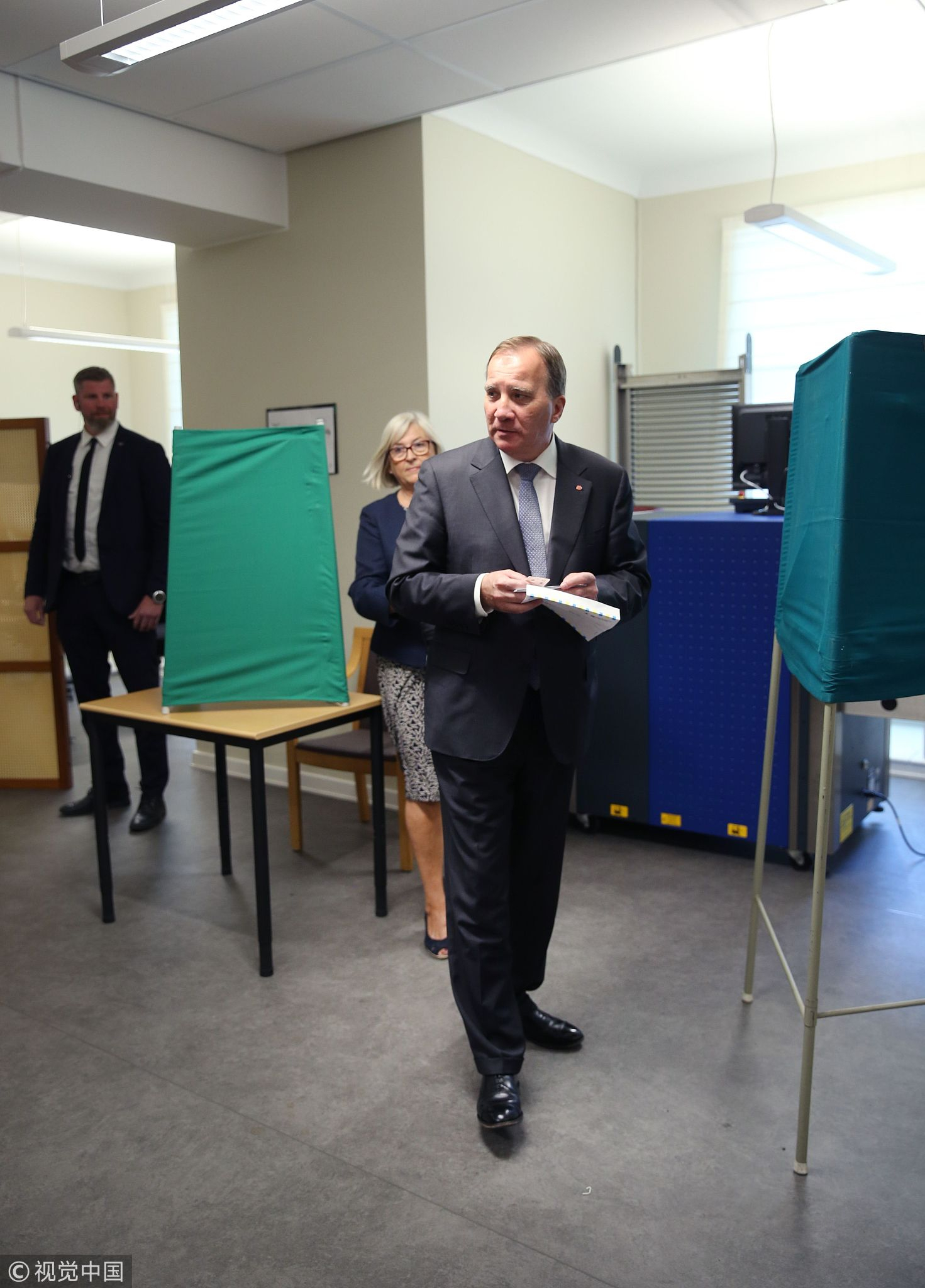 Swedish Prime Minister and leader of the Social Democratic party, Stefan Lofven votes in the Swedish general elections at a polling station in Stockholm, Sweden, September 9, 2018. /VCG Photo