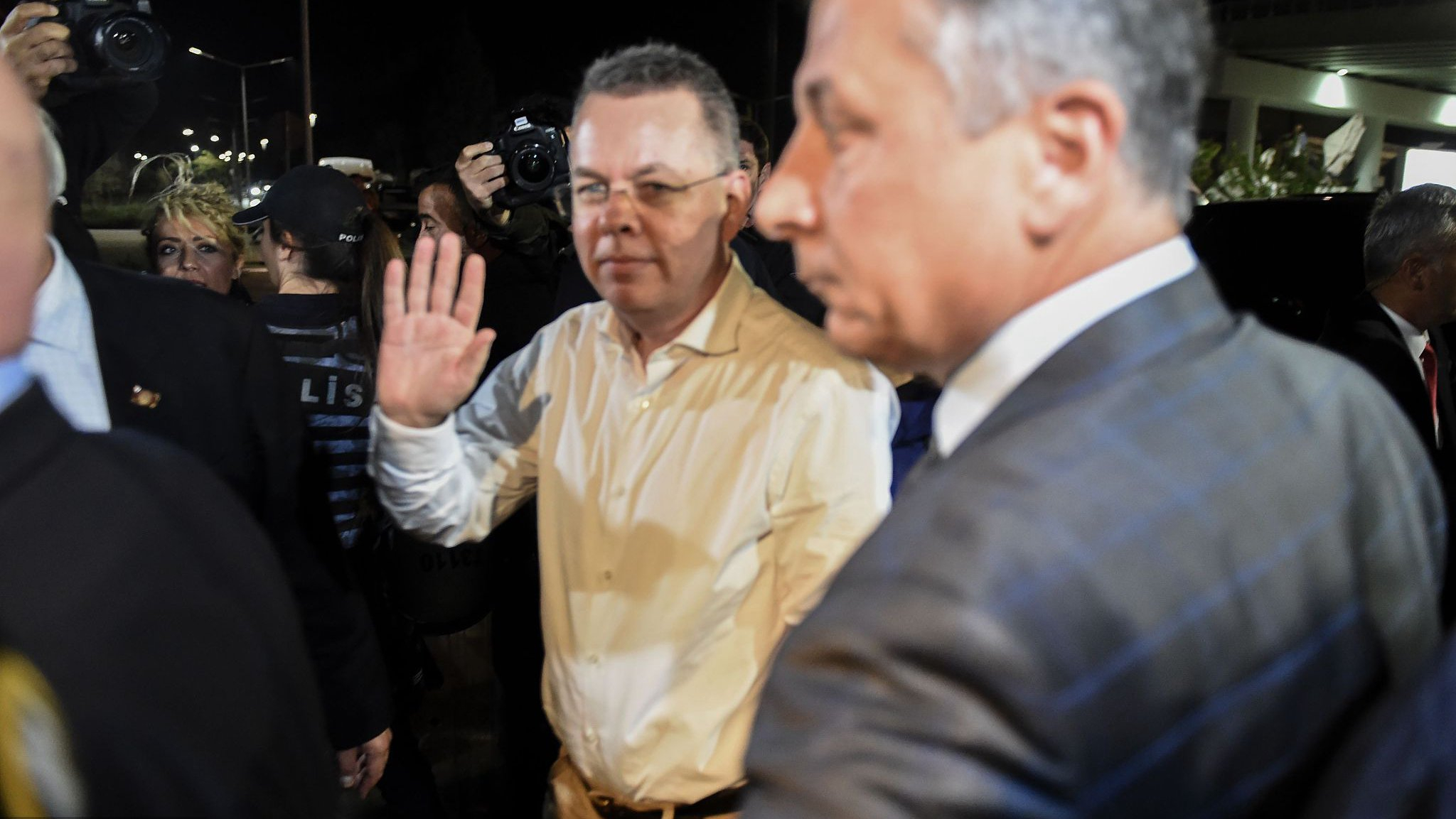 US pastor Andrew Craig Brunson is escorted by Turkish plain clothes police officers to his house in Izmir, Turkey, July 25, 2018. /VCG Photo