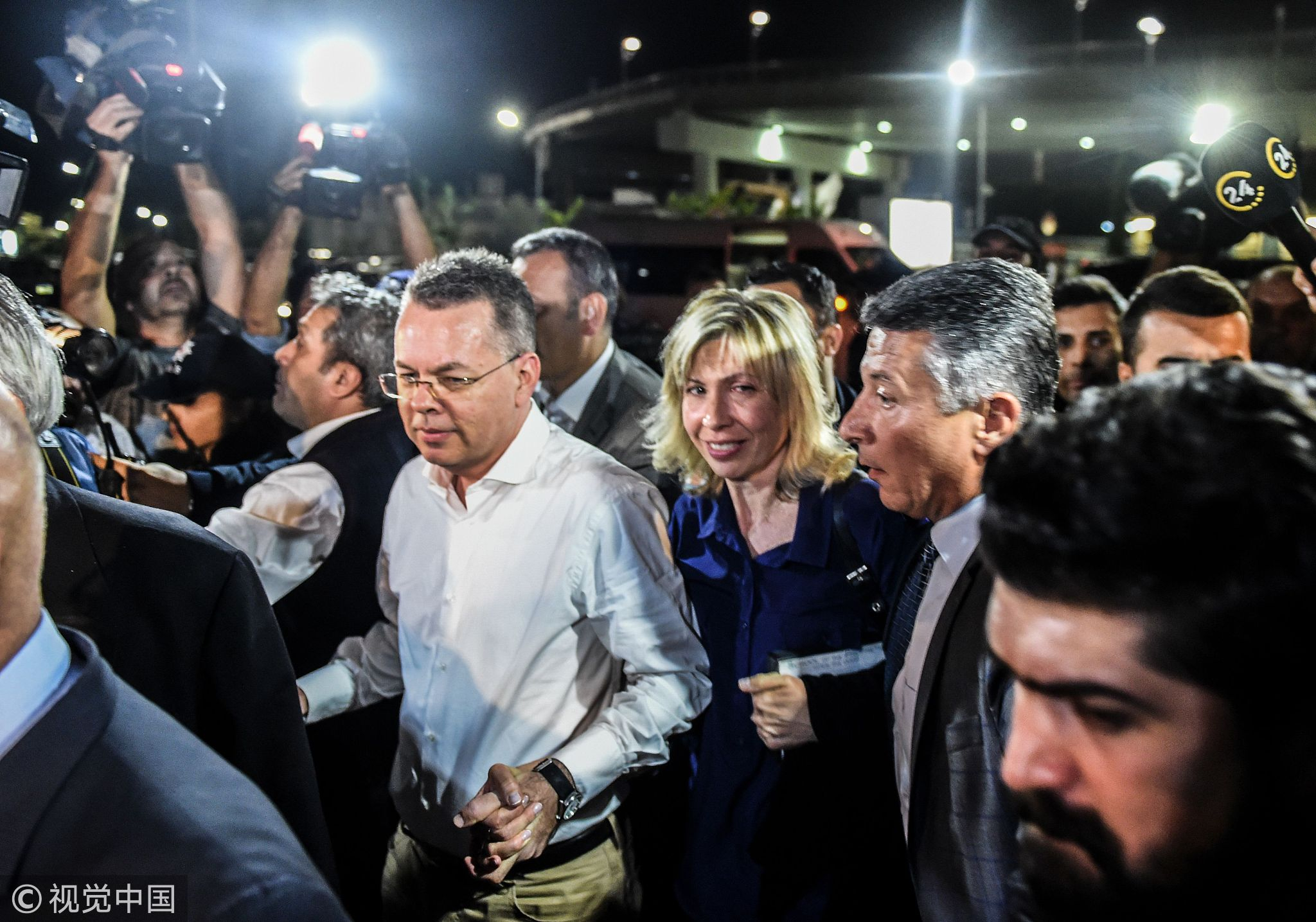 US pastor Andrew Craig Brunson (C,L) arrives at Adnan Menderes airport in Izmir after being freed following a trial in a court in Aliaga in western Izmir province, Turkey, October 12, 2018. /VCG Photo