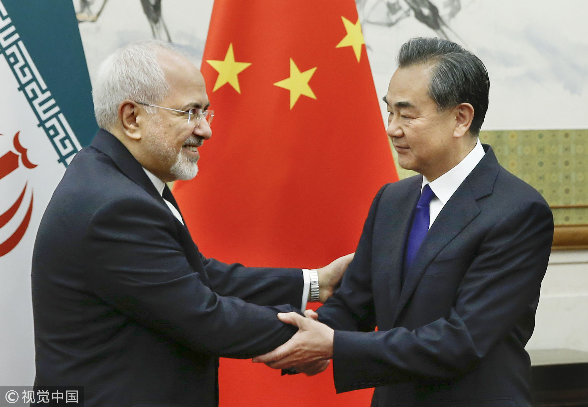 Chinese State Councilor and Foreign Minister Wang Yi (R) shake hands with Iranian Foreign Minister Javad Zarif (L) at the Diaoyutai State Guesthouse in Beijing on May 13, 2018. /VCG Photo