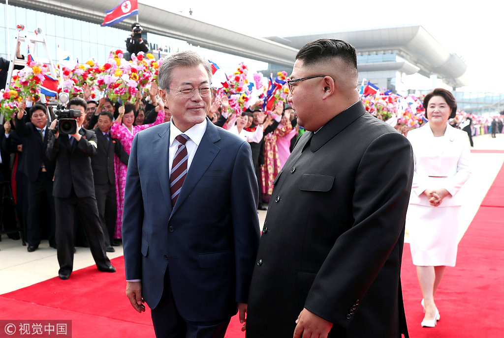 ROK President Moon Jae-in and DPRK leader Kim Jong Un attend an official welcome ceremony at Pyongyang Sunan International Airport, in Pyongyang, DPRK, September 18, 2018. /VCG Photo