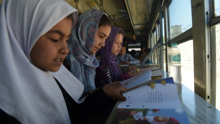 The door of the blue bus slides open and dozens of children excitedly bound up the steps, eager to get their hands on hard-to-find books in Kabul's first mobile library.
