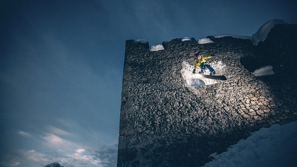 Daredevil snowboarder challenged himself as he leaped from the window of a 700-year-old castle in a dramatic stunt which took years to plan. /VCG Photo