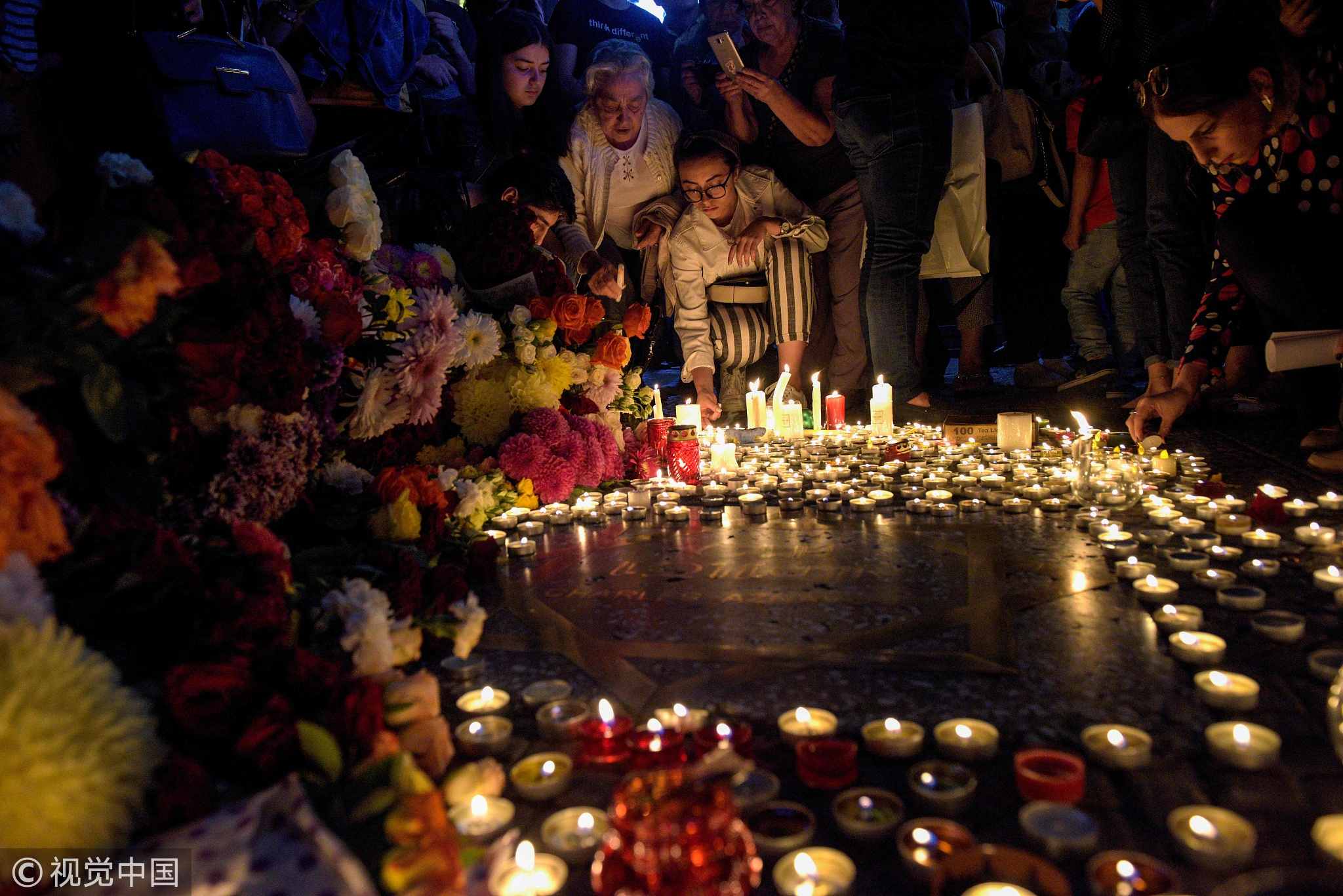 People lay flowers and place candles around the star of Charles Aznavour at the square named after him in Yerevan on October 1, 2018. /VCG Photo