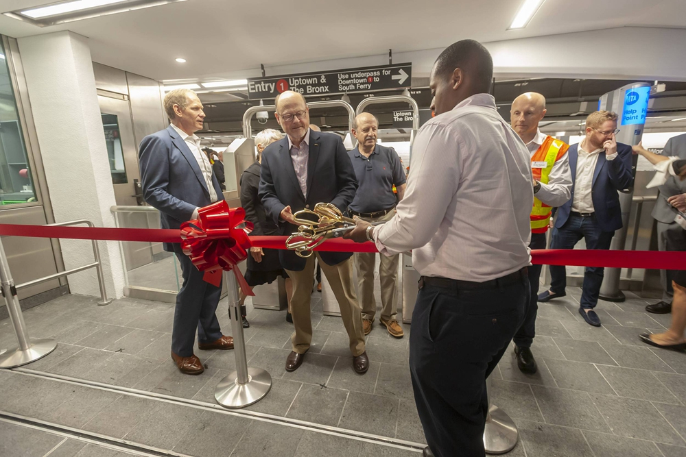 MTA Chairman Joe Lhota receives the ceremonial ribbon-cutting scissors at the Cortlandt Street-World Trade Center subway reopening, Sept. 8, 2018. /VCG Photo