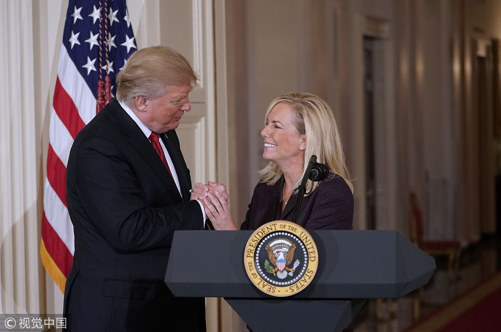 U.S. President Donald Trump clasps hands with Kirstjen Nielsen after nominating her to be the next Homeland Security Secretary in the East Room of the White House in Washington, DC. US, October 12, 2017. /VCG Photo