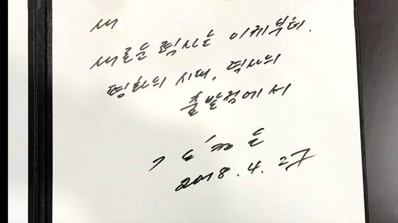"A new history begins now – at the starting point of history and the era of peace," Kim Jong Un writes in the guestbook at the Peace House summit venue as Moon Jae-in stands next to him.