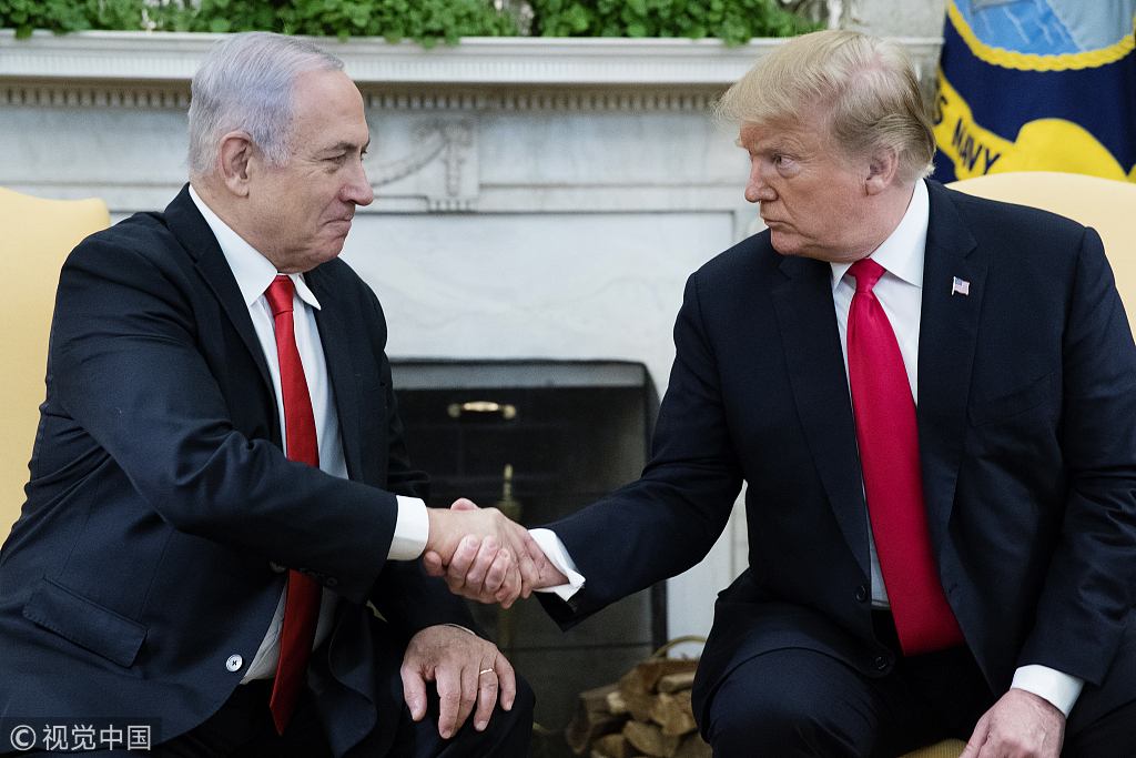 Benjamin Netanyahu, Israel's prime minister(L), and U.S. President Donald Trump shake hands during a meeting, Washington, D.C., March 25, 2019. /VCG Photo
