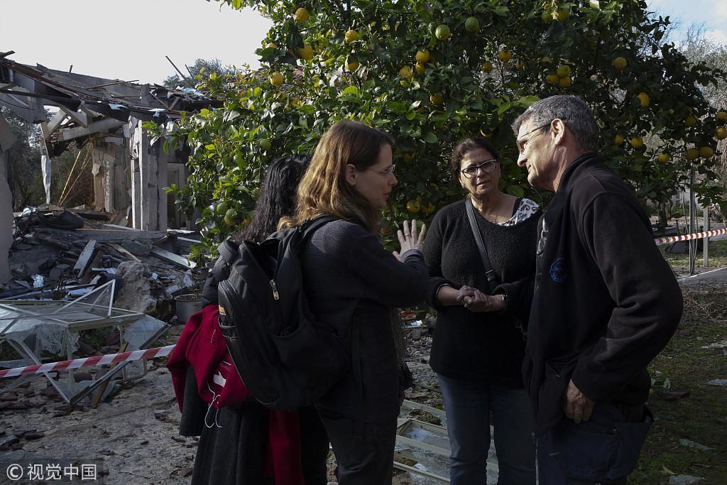 Robert Wolf speaks to media after his house was hit by a rocket in the village of Mishmeret, north of Tel Aviv, March 25, 2019. / VCG Photo