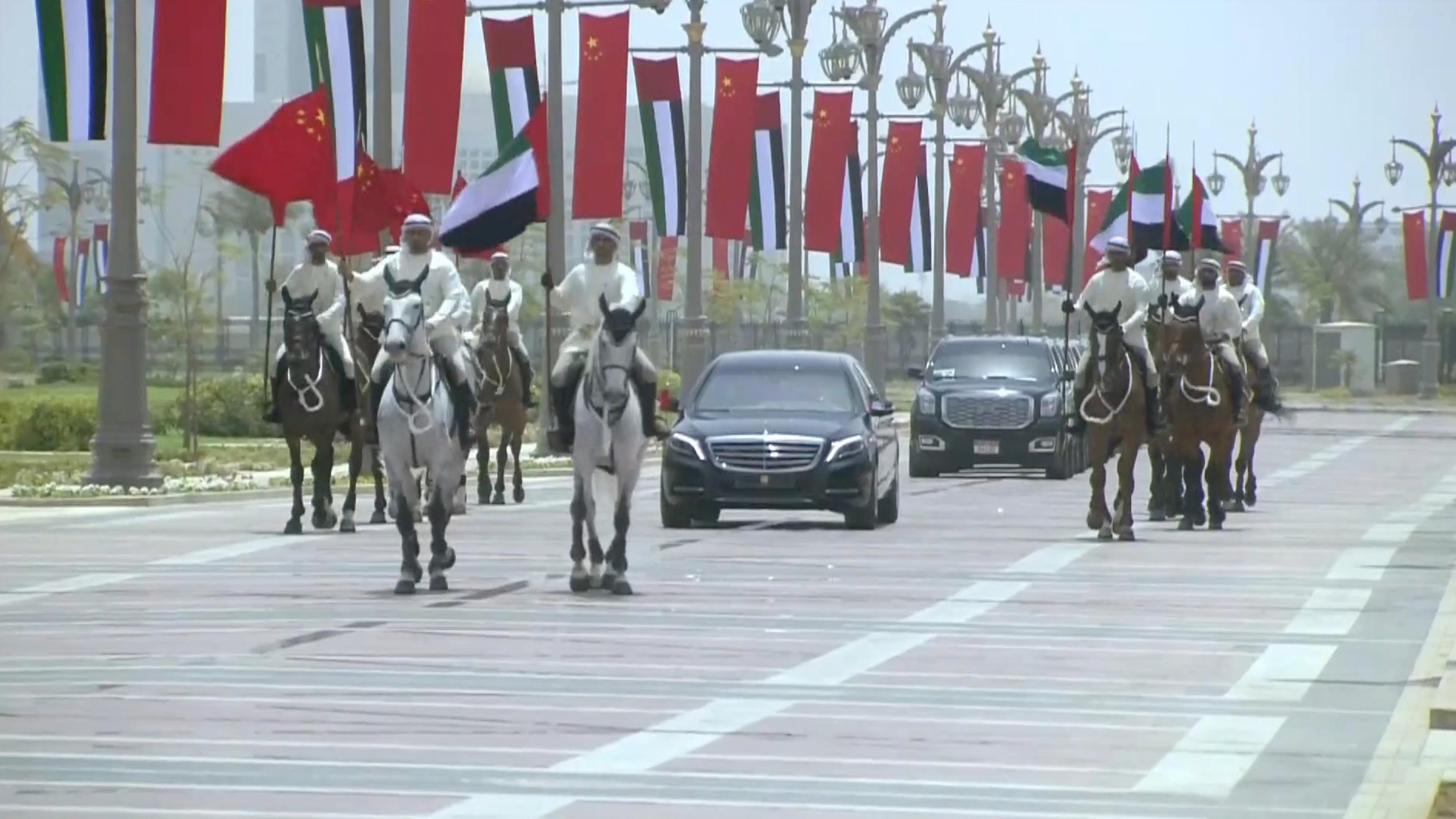 Members of the United Arab Emirates (UAE) Armed Forces Cavalry Division escorted Chinese President Xi Jinping's motorcade towards the UAE Presidential Palace on Friday. A 21-gun salute was fired in honor of the guest.
