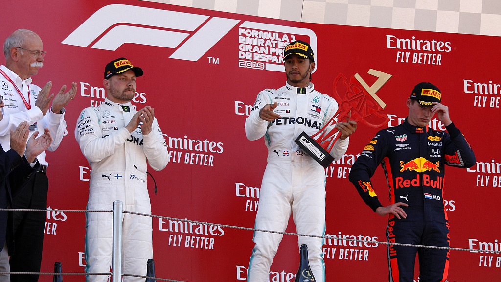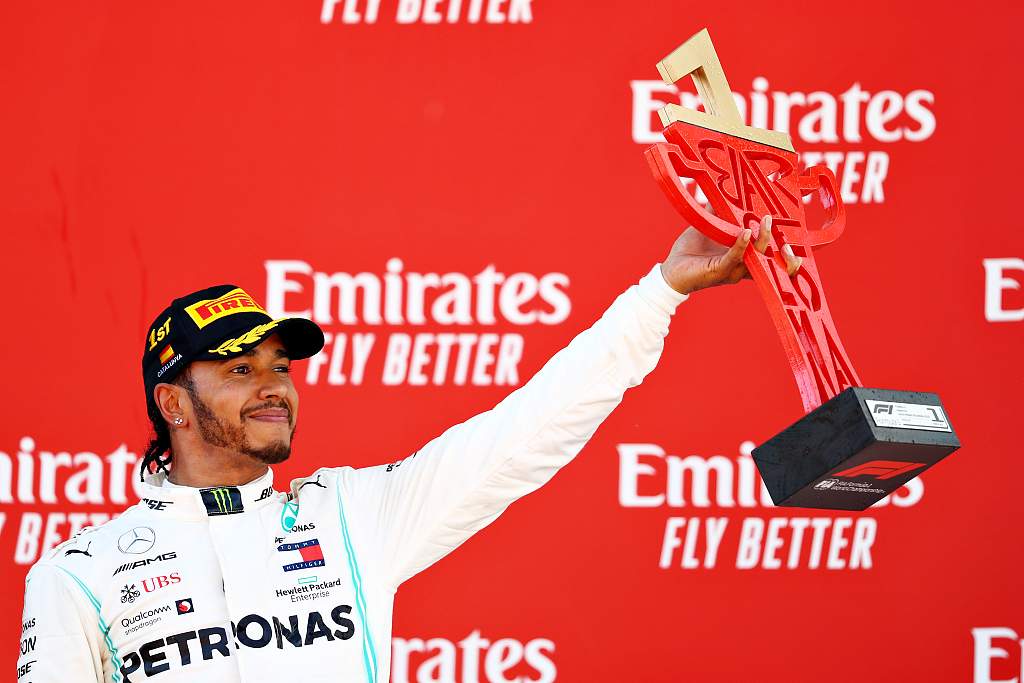 Lewis Hamilton of Mercedes GP celebrates on the podium during the F1 Grand Prix of Spain at Circuit de Barcelona-Catalunya in Barcelona, Spain, May 12, 2019. /VCG Photo