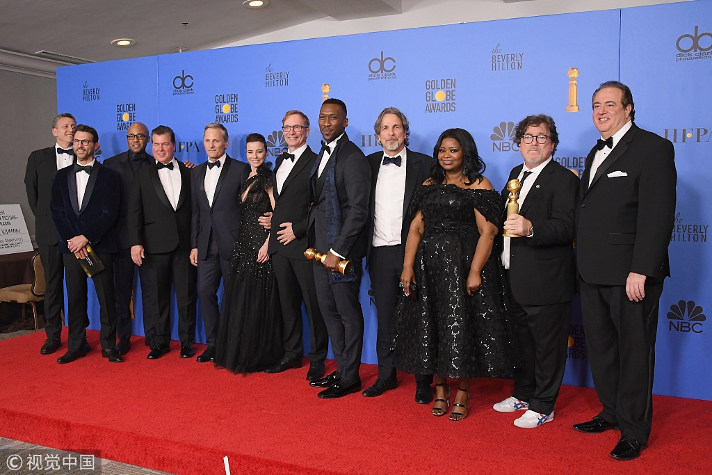 The cast and producers of "Green Book" posing in the press room during the 76th Annual Golden Globe Awards at the Beverly Hilton Hotel in Beverly Hills, California, January 6, 2019. /VCG Photo