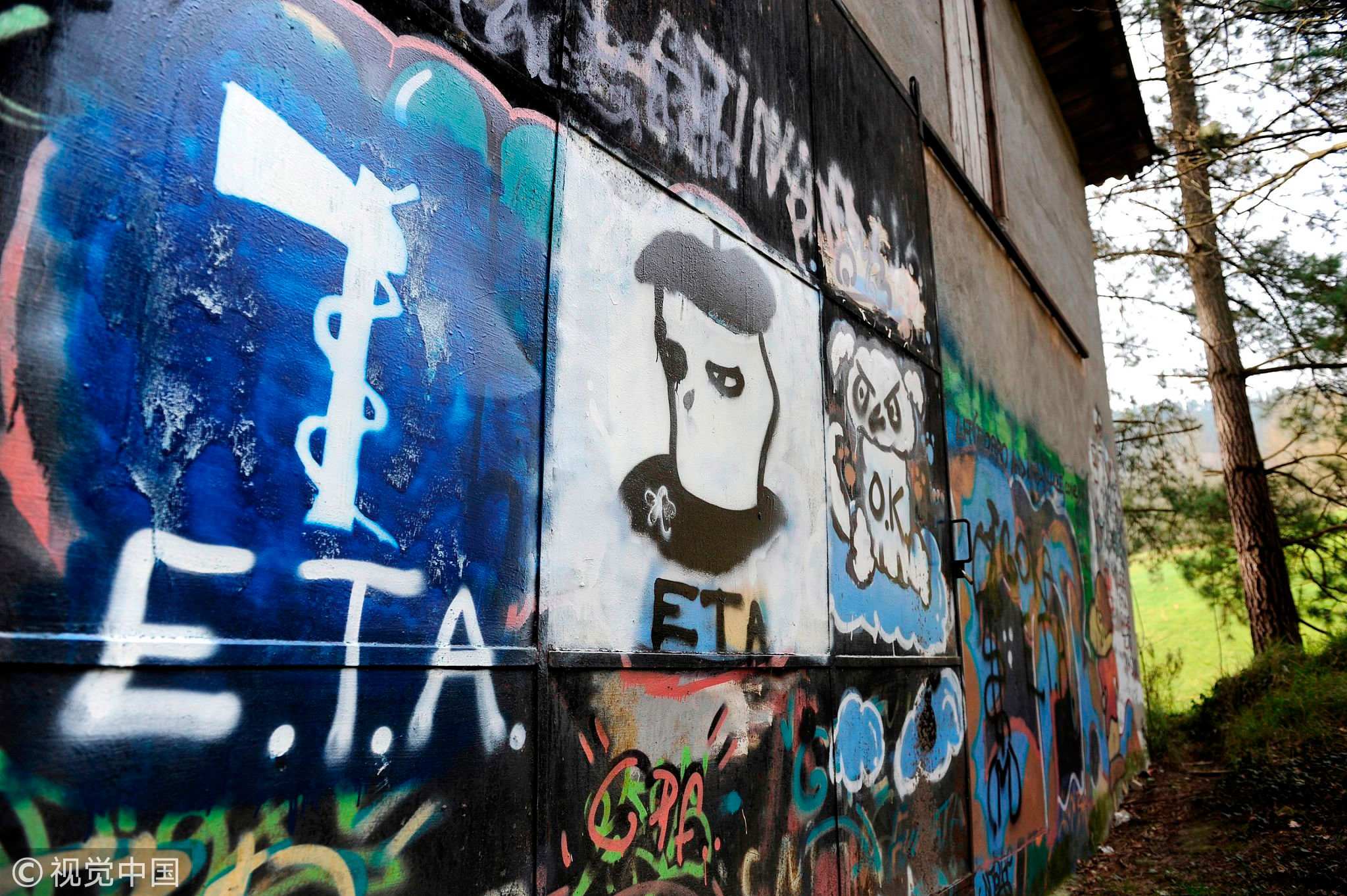 Graffiti depicts the logo of Basque separatist armed group ETA and an ETA activist's head in the northern Basque village of Llodio, Spain, March 23, 2010. /VCG Photo