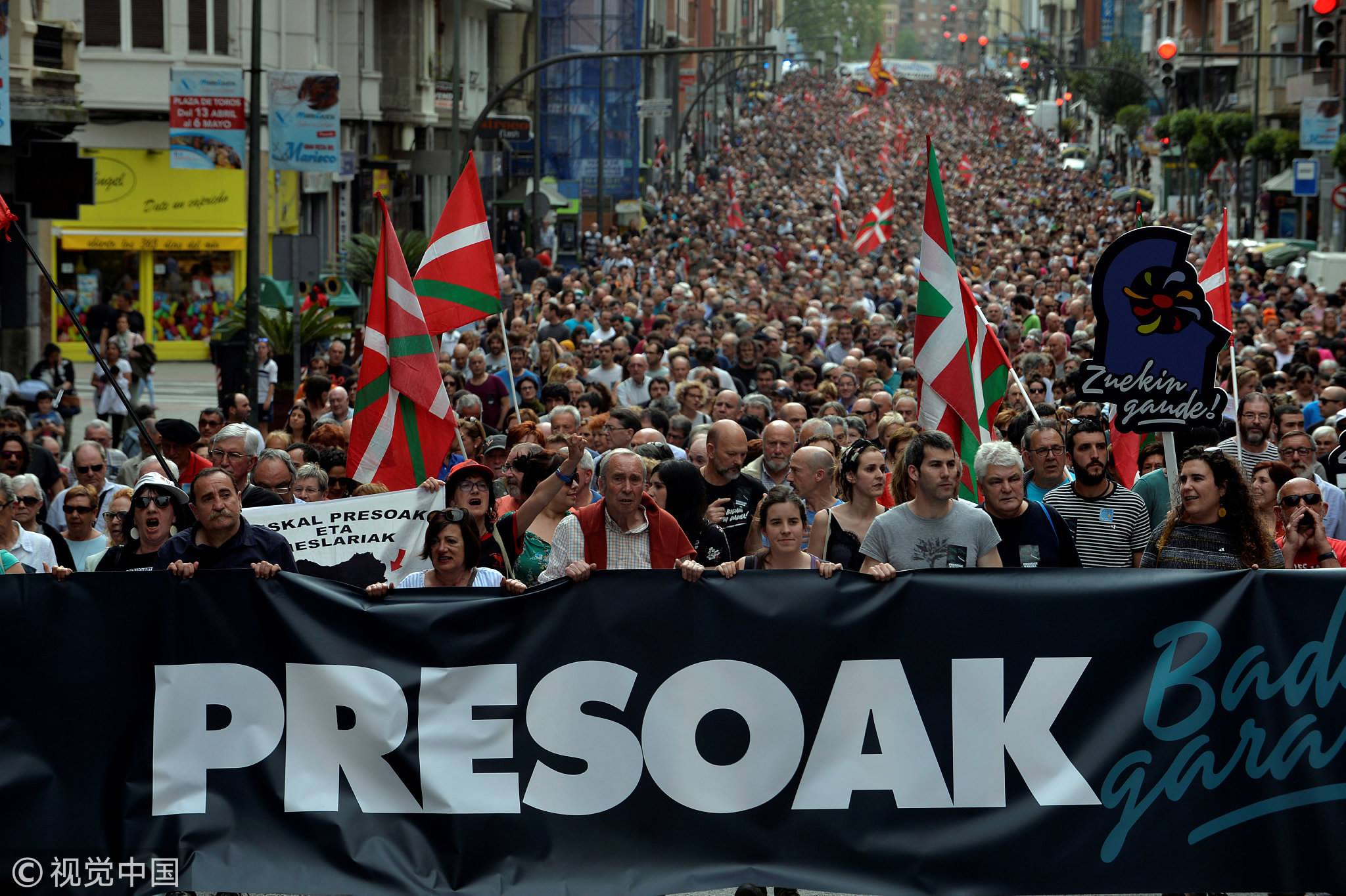 Protesters march behind a banner during a rally in support of ETA prisoners in Bilbao, Spain, April 21, 2018. /VCG Photo