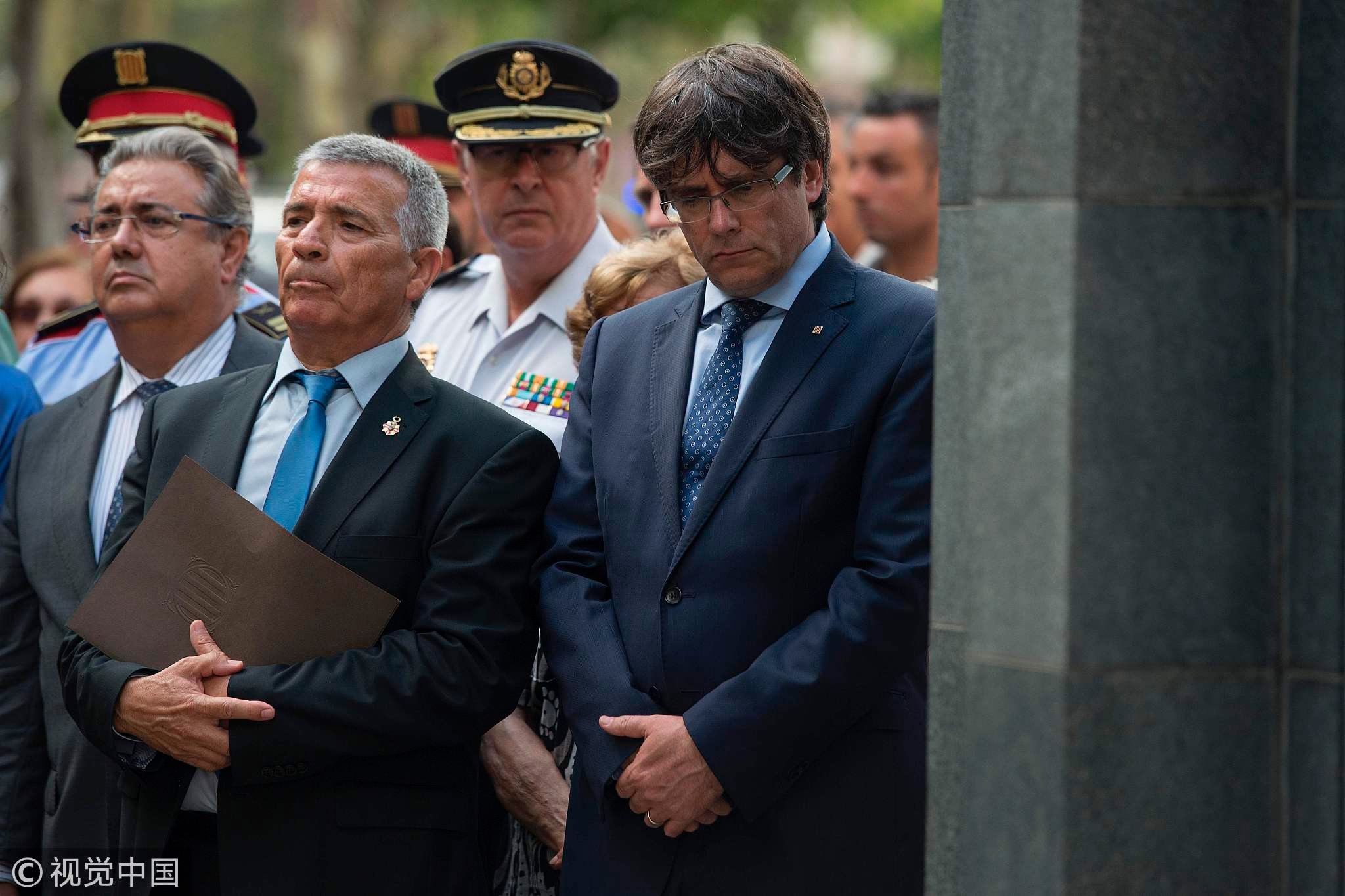 Catalan regional government leader Carles Puigdemont (R) and Spanish Interior Minister Juan Ignacio Zoido (L) attend a ceremony marking the 30th anniversary of ETA's attack against the Hipercor supermarket in Barcelona, Spain, June 19, 2017. /VCG Photo