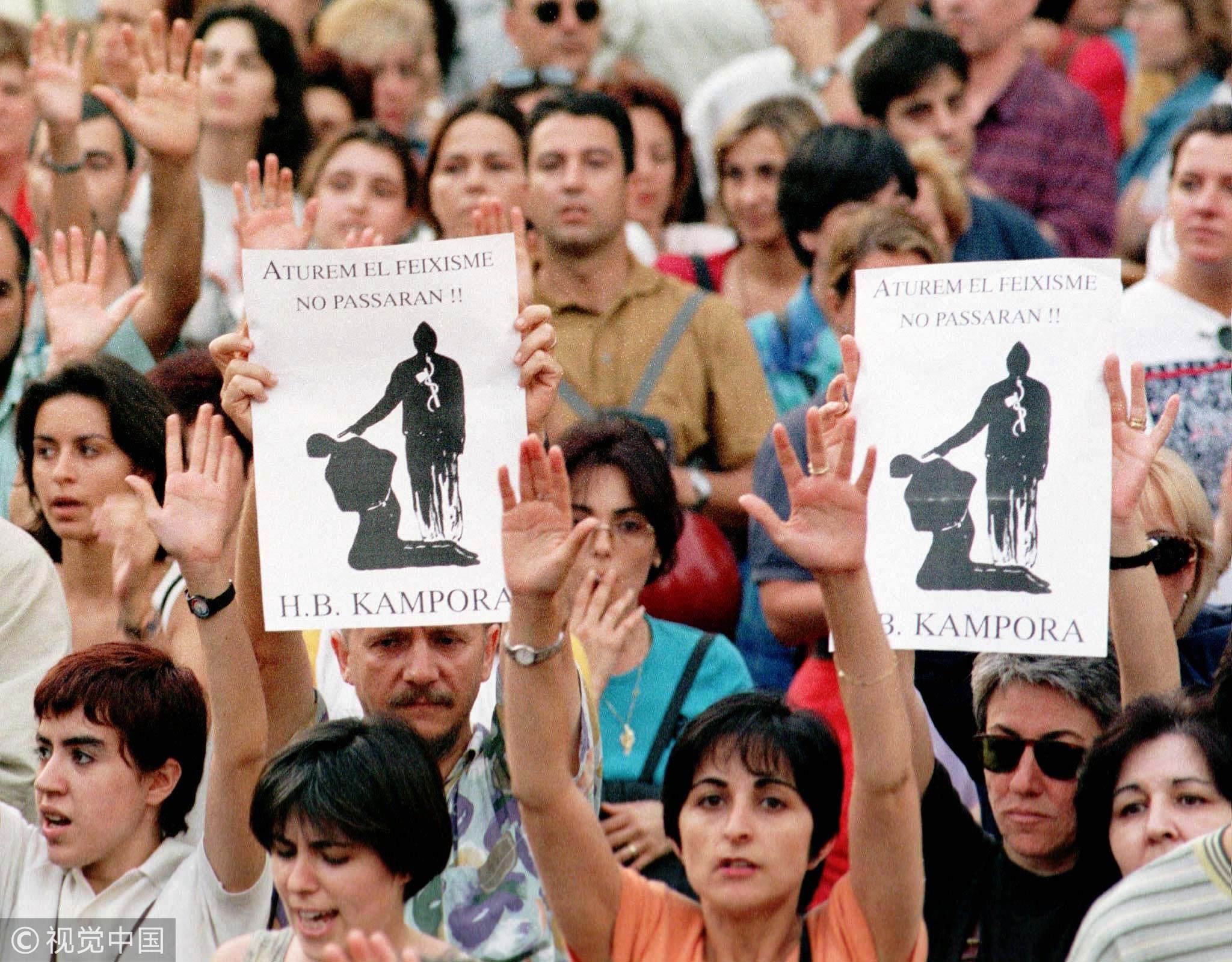 A million Barcelona protesters wave portraits of Miguel Blanco and chant "Basques, yes! ETA, no!" in central Barcelona, Spain, July 14, 1997. /VCG Photo