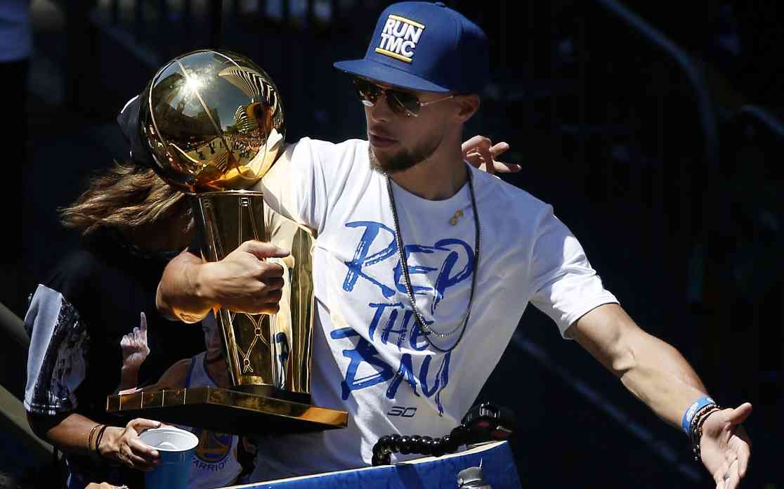 Stephen Curry greets fans and shows the trophy during the Warriors Championship parade on June 12. /VCG Photo