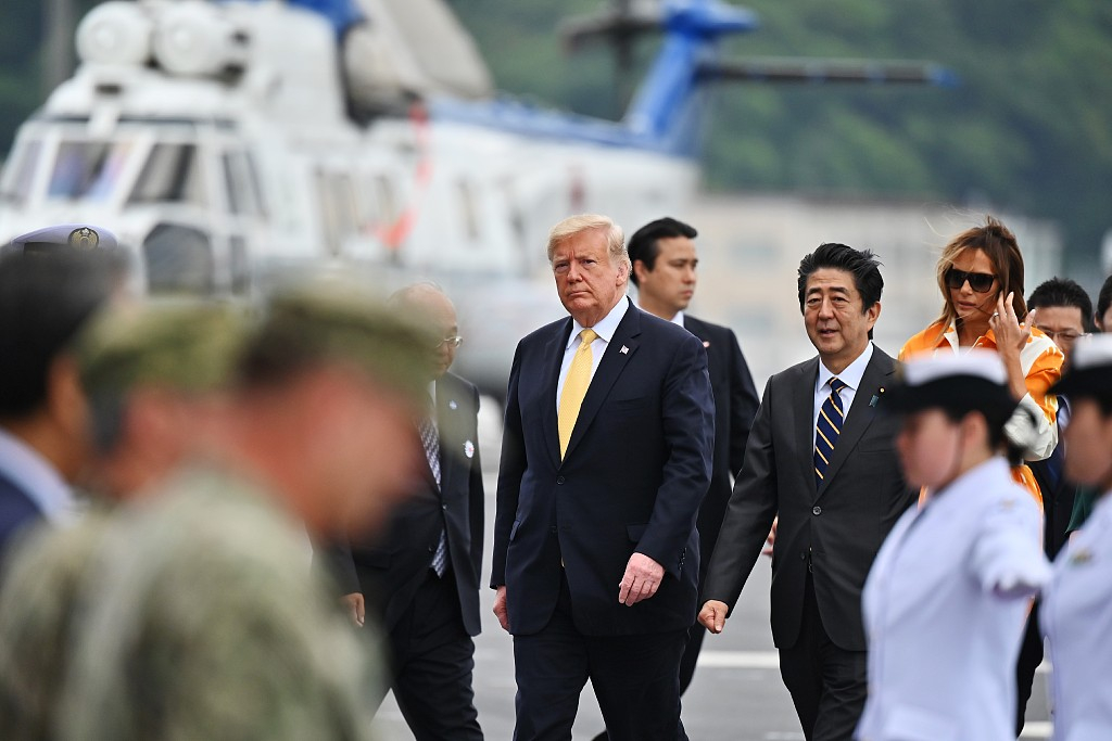 U.S. President Donald Trump (L) and Japan's Prime Minister Shinzo Abe arrive aboard Japan's navy ship Kaga in Yokosuka, Japan, May 28, 2019. /VCG Photo