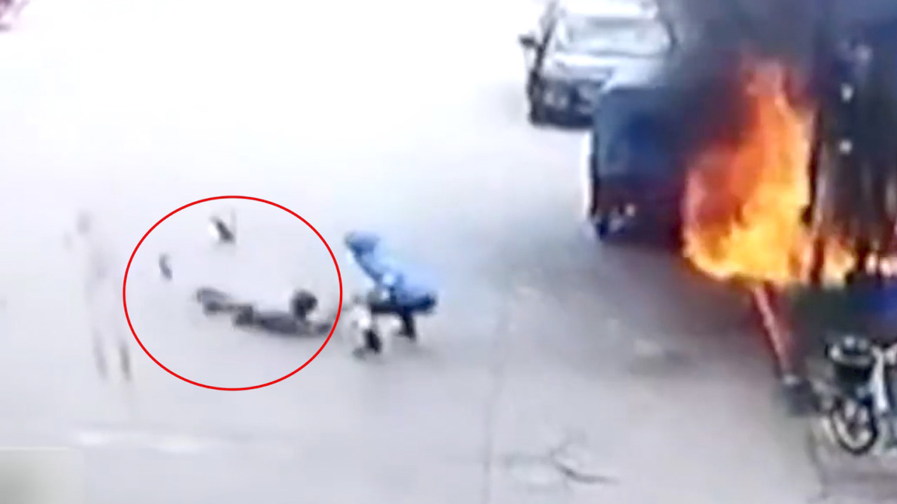 A man’s clothes caught fire after a side tricycle burst into flames in Guangzhou City of south China’s Guangdong Province on June 16. He instantly started to roll on the ground to extinguish the fire and with the help of a passing food delivery man, the fire on his clothes was put out after few minutes.